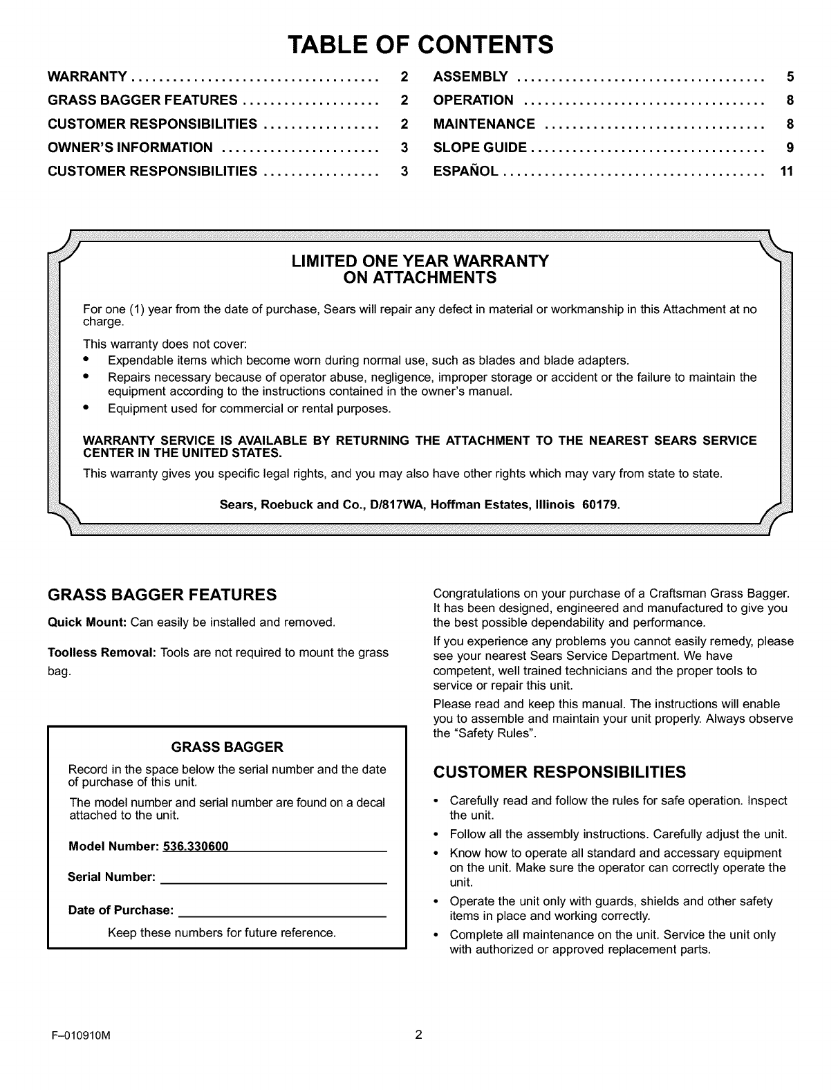 Congratulations on your purchase of a Craftsman Grass Bagger.