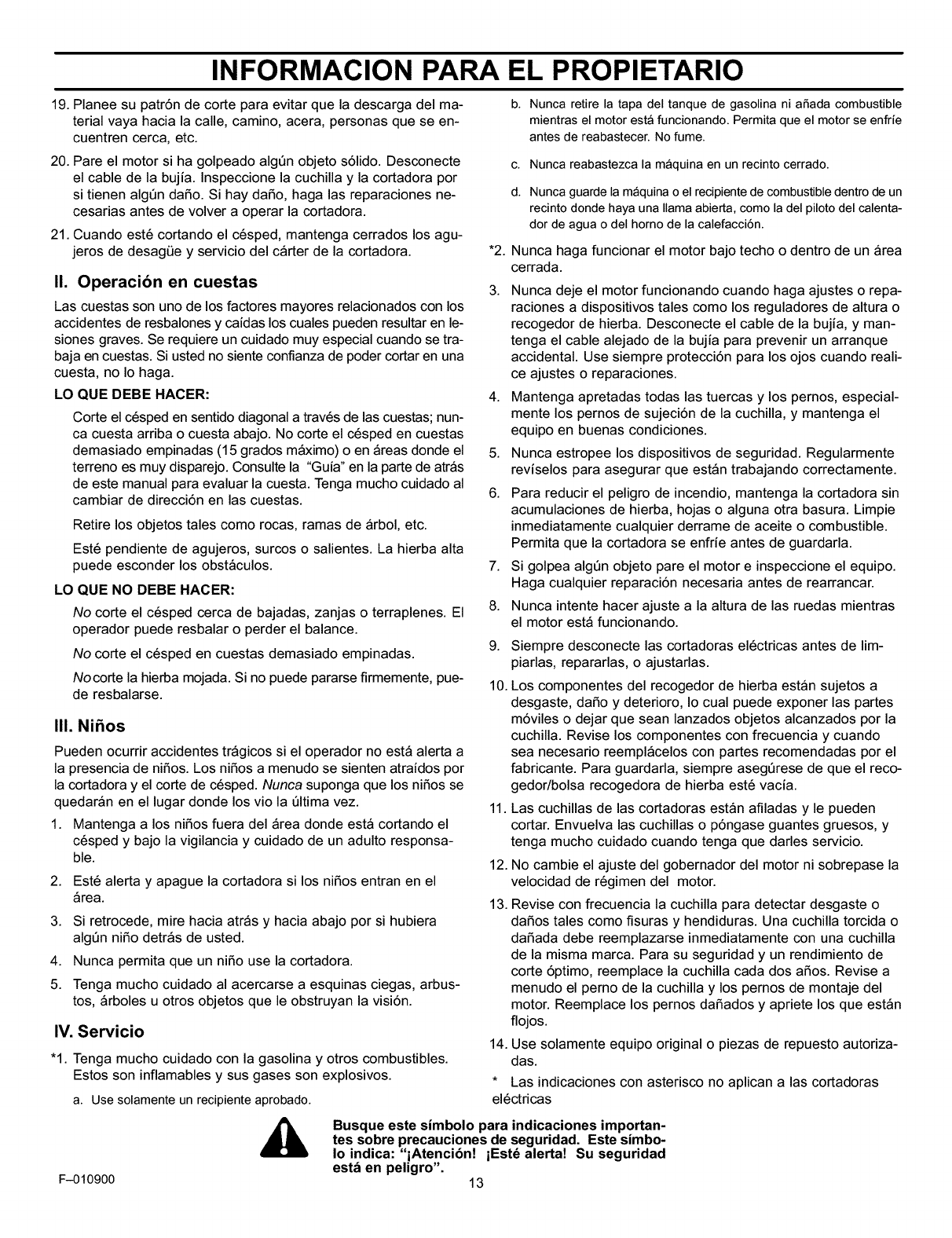 diagonal a traves de las cuestas. Opere una cortadora de cesped manual en sentido diagonal a traves de las cuestas, nunca