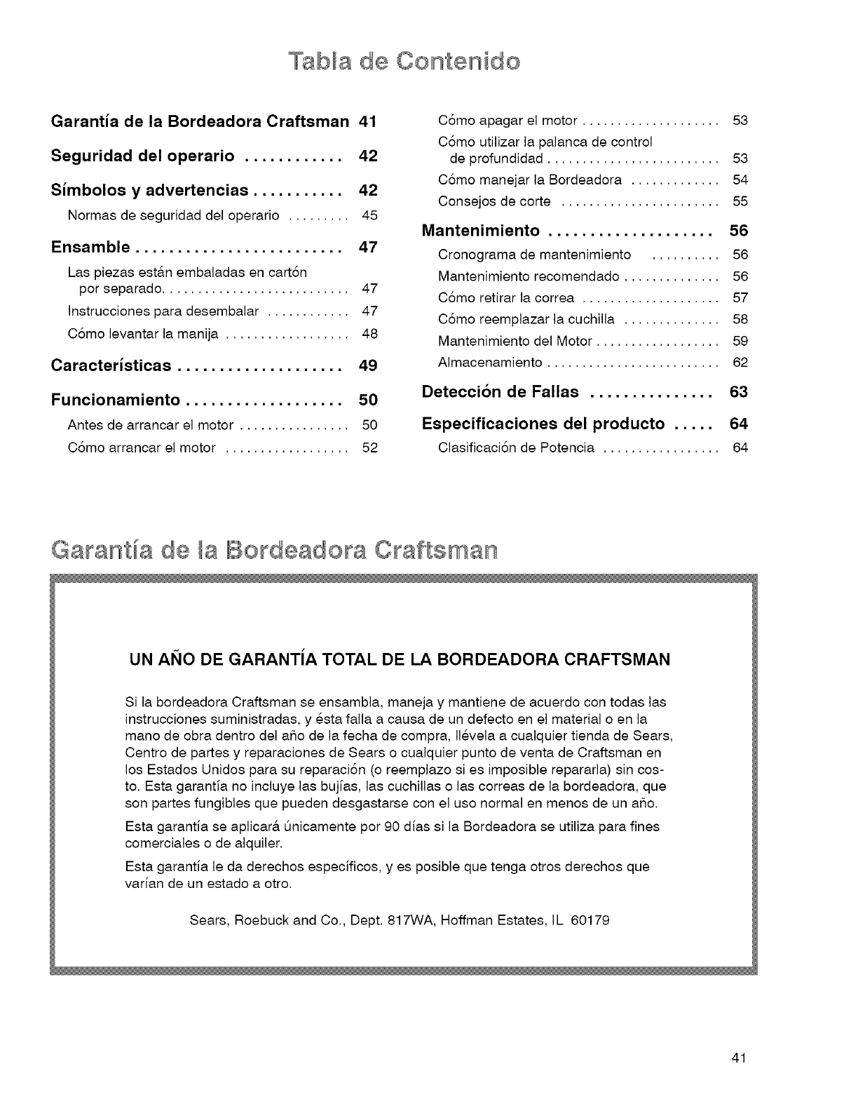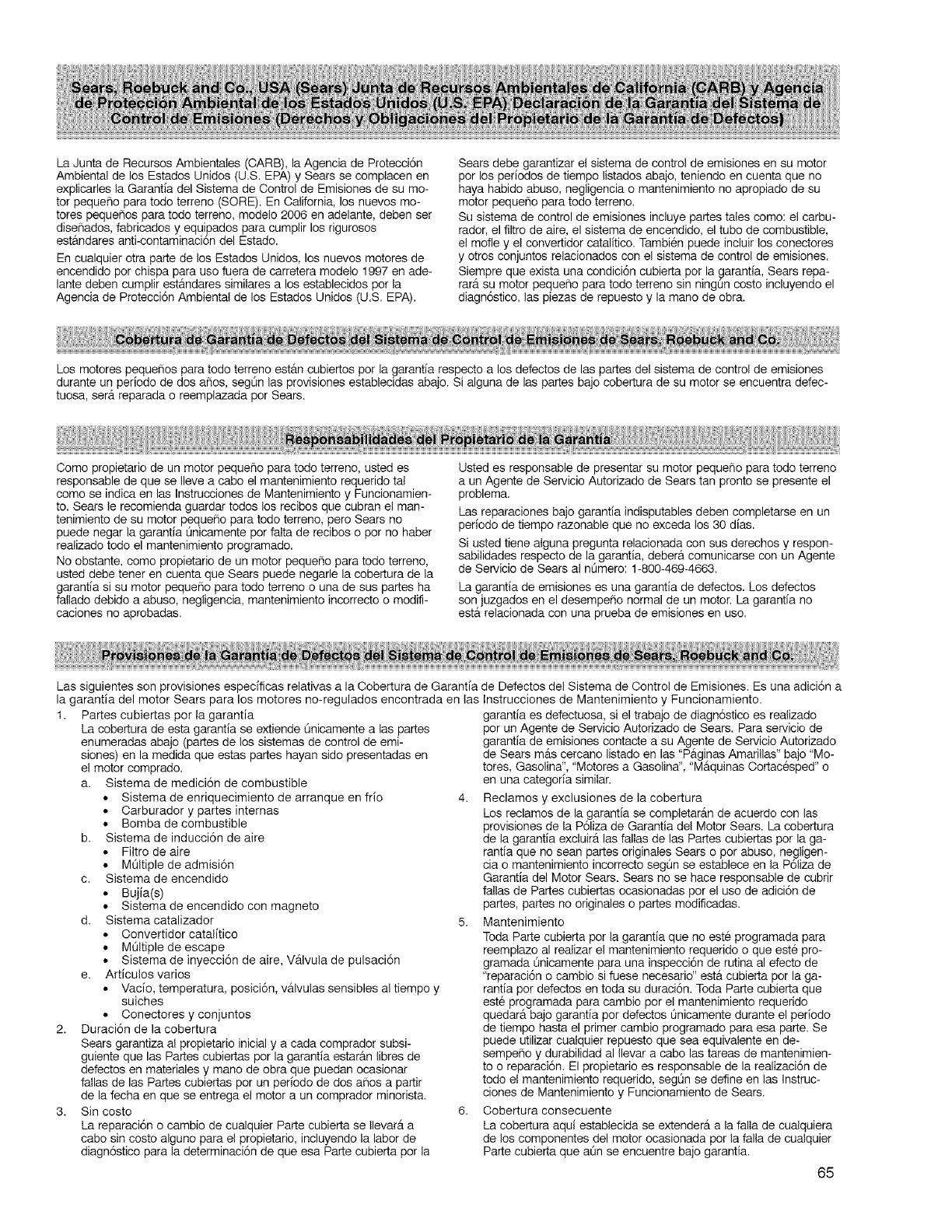 Garantia del Motor Sears. Sears no se hace responsable de cubrir