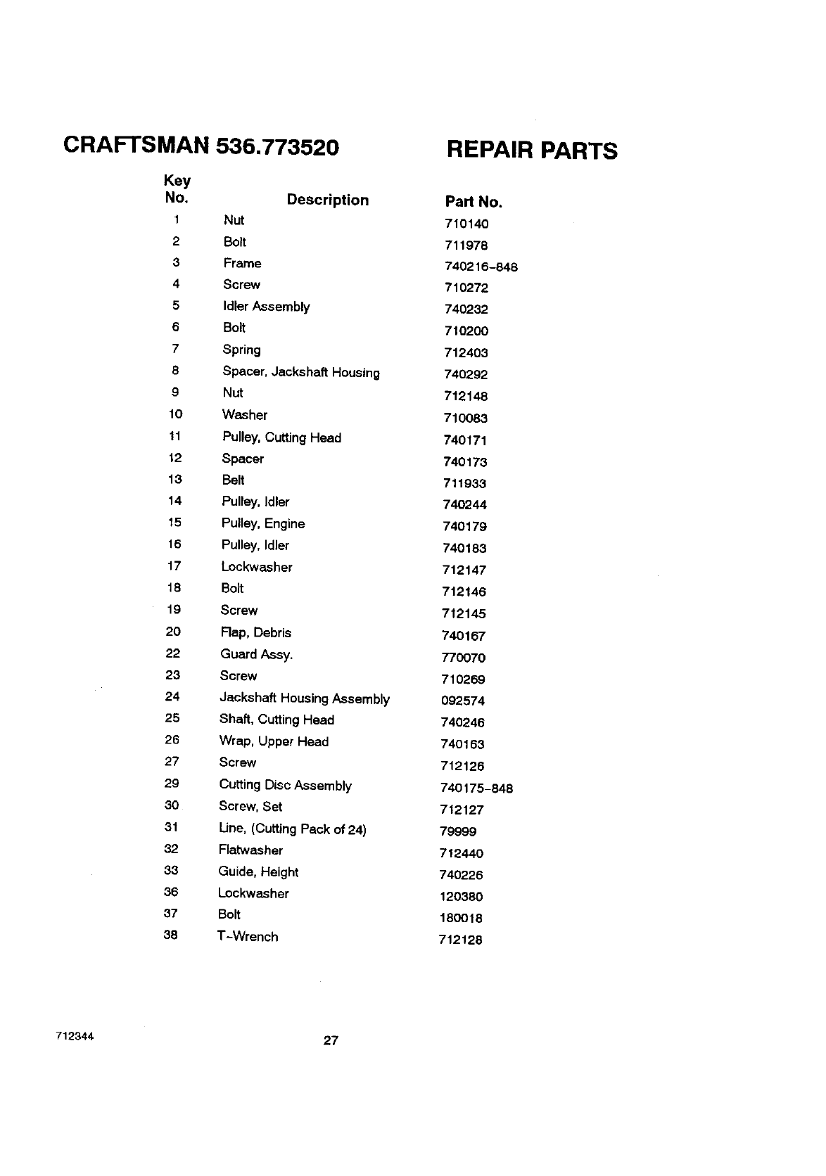 User Manual: Craftsman 536773520 536773520 CRAFTSMAN HIGH WHEEL BRUSH TRIMMER - Manuals and Guides View the owners manual for your CRAFTSMAN HIGH WHEEL BRUSH TRIMMER #536773520. Home:Lawn & Garden Parts:Craftsman Parts:536773520 Craftsman Grass trimmer (weed wacker) Manual