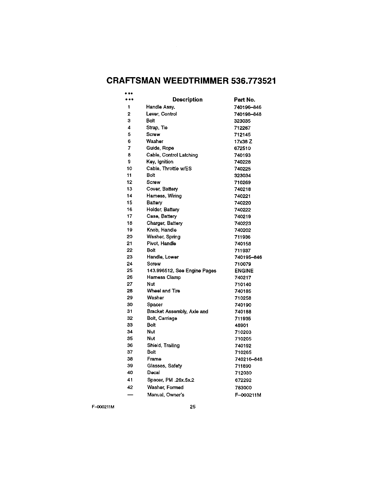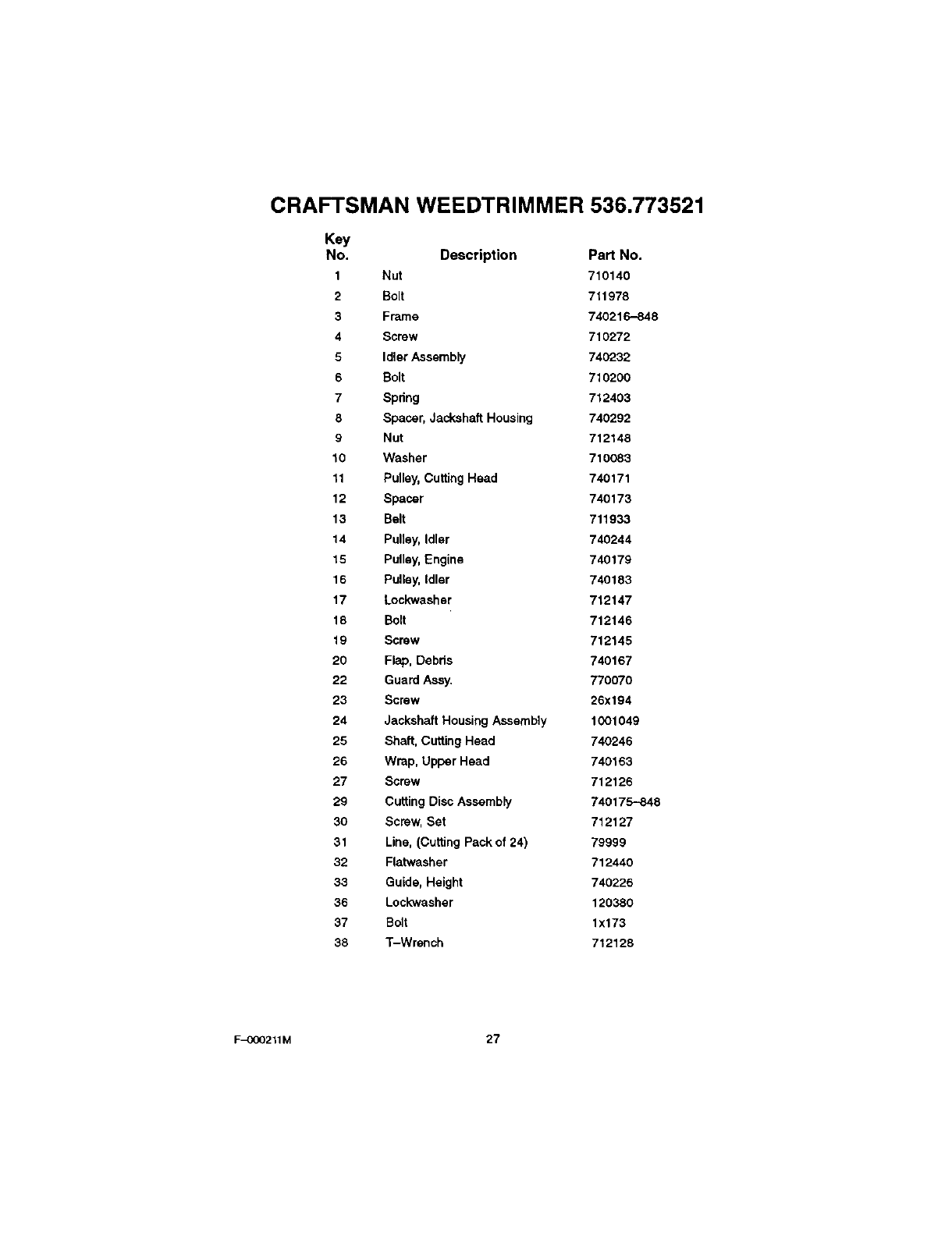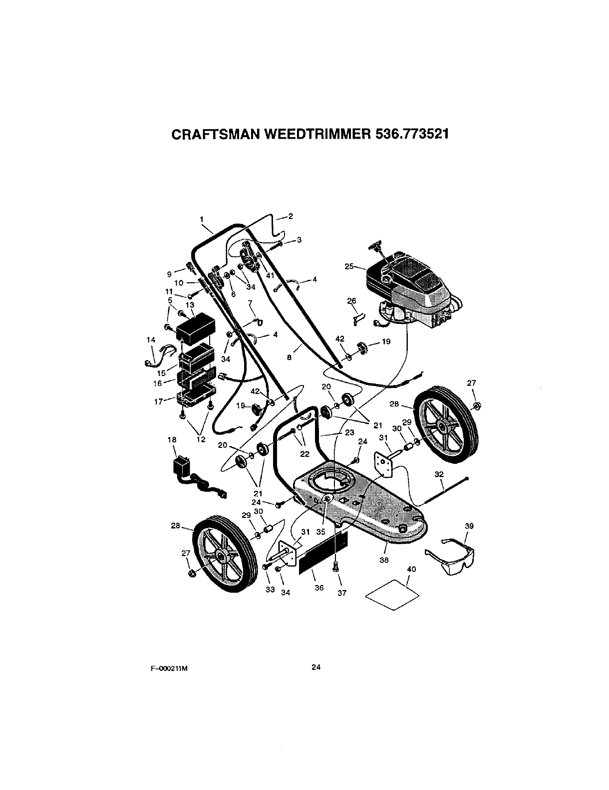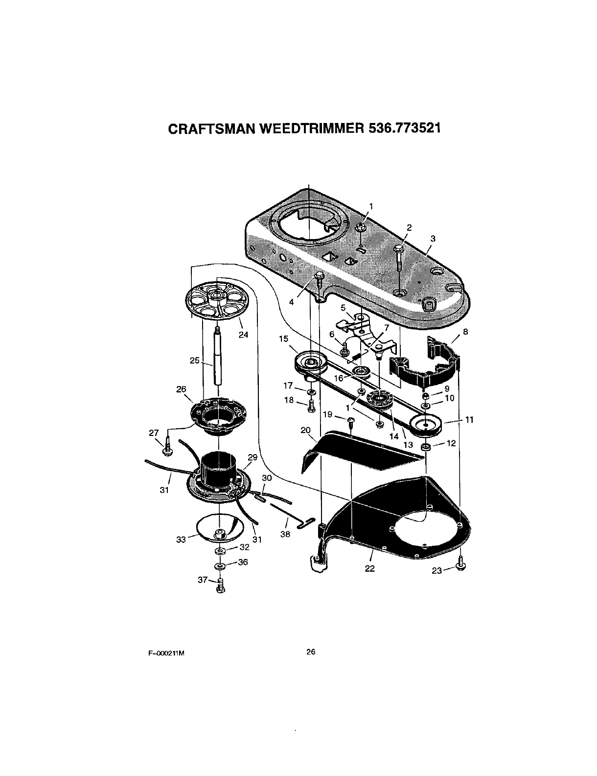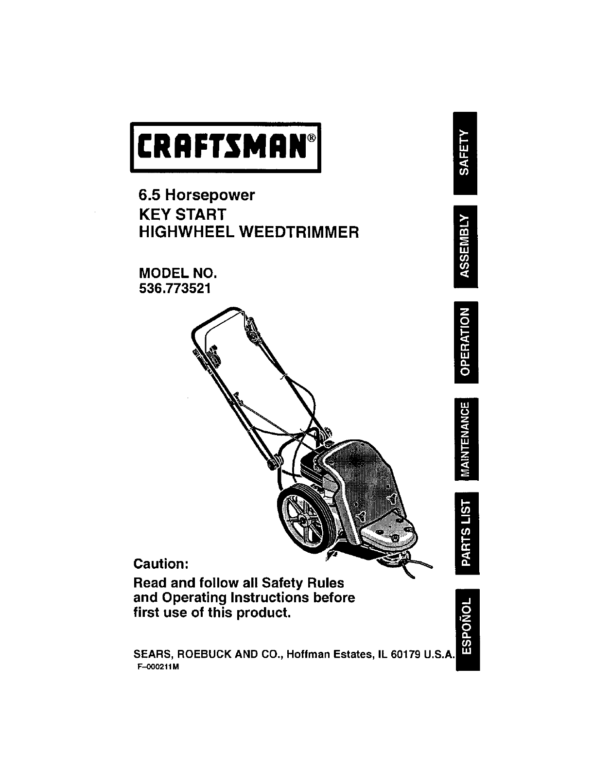 User Manual: Craftsman 536773521 536773521 CRAFTSMAN HIGHWHEEL WEEDTRIMMER - Manuals and Guides View the owners manual for your CRAFTSMAN HIGHWHEEL WEEDTRIMMER #536773521. Home:Lawn & Garden Parts:Craftsman Parts:536773521 Craftsman Grass trimmer (weed wacker) Manual