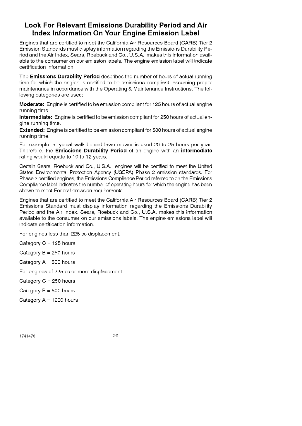 Ciertos motores Sears, Roebuck and Co., U.S.A. estaran certificados per cumplir con las nor-