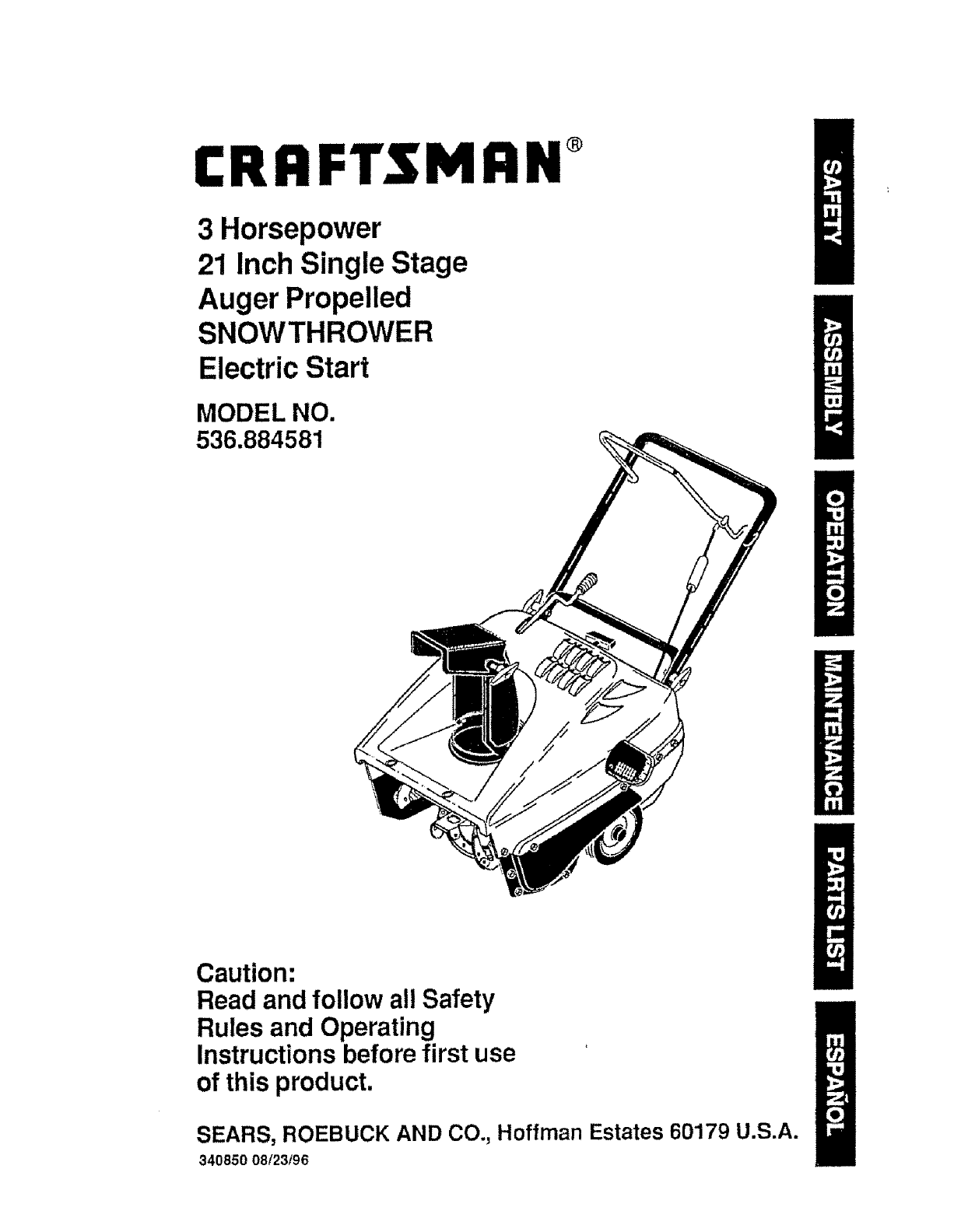 User Manual: Craftsman 536884581 536884581 CRAFTSMAN SNOW THROWER - Manuals and Guides View the owners manual for your CRAFTSMAN SNOW THROWER #536884581. Home:Lawn & Garden Parts:Craftsman Parts:Craftsman SNOW THROWER Manual