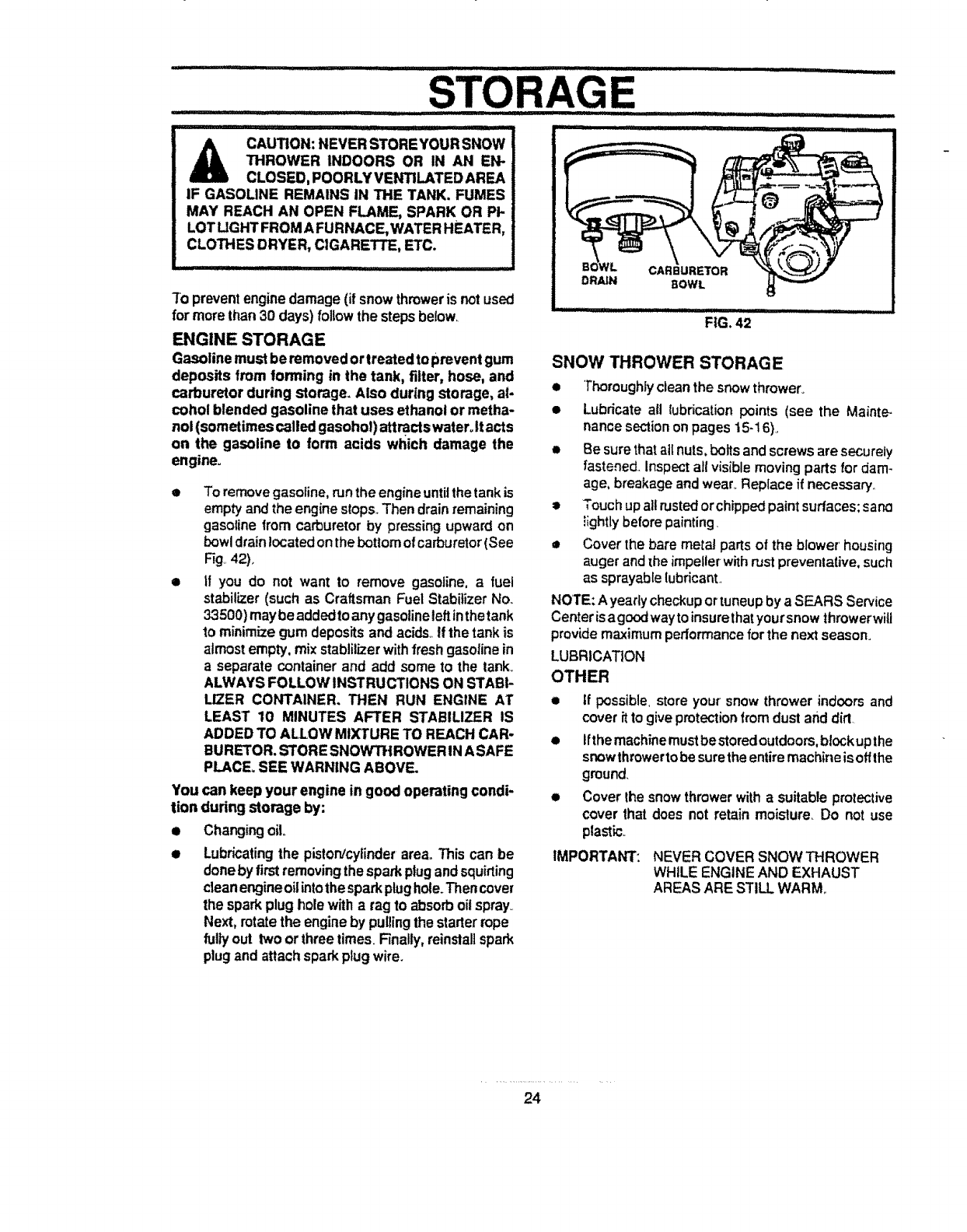 • Never store fuel or snow th rower wilh fuel in the