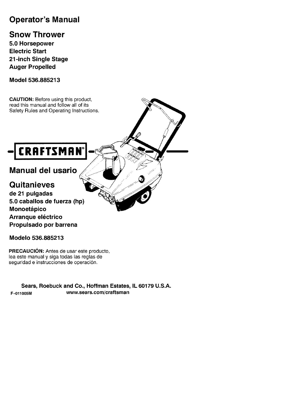 User Manual: Craftsman 536885213 536885213 CRAFTSMAN SNOW THROWER - Manuals and Guides View the owners manual for your CRAFTSMAN SNOW THROWER #536885213. Home:Lawn & Garden Parts:Craftsman Parts:Craftsman SNOW THROWER Manual
