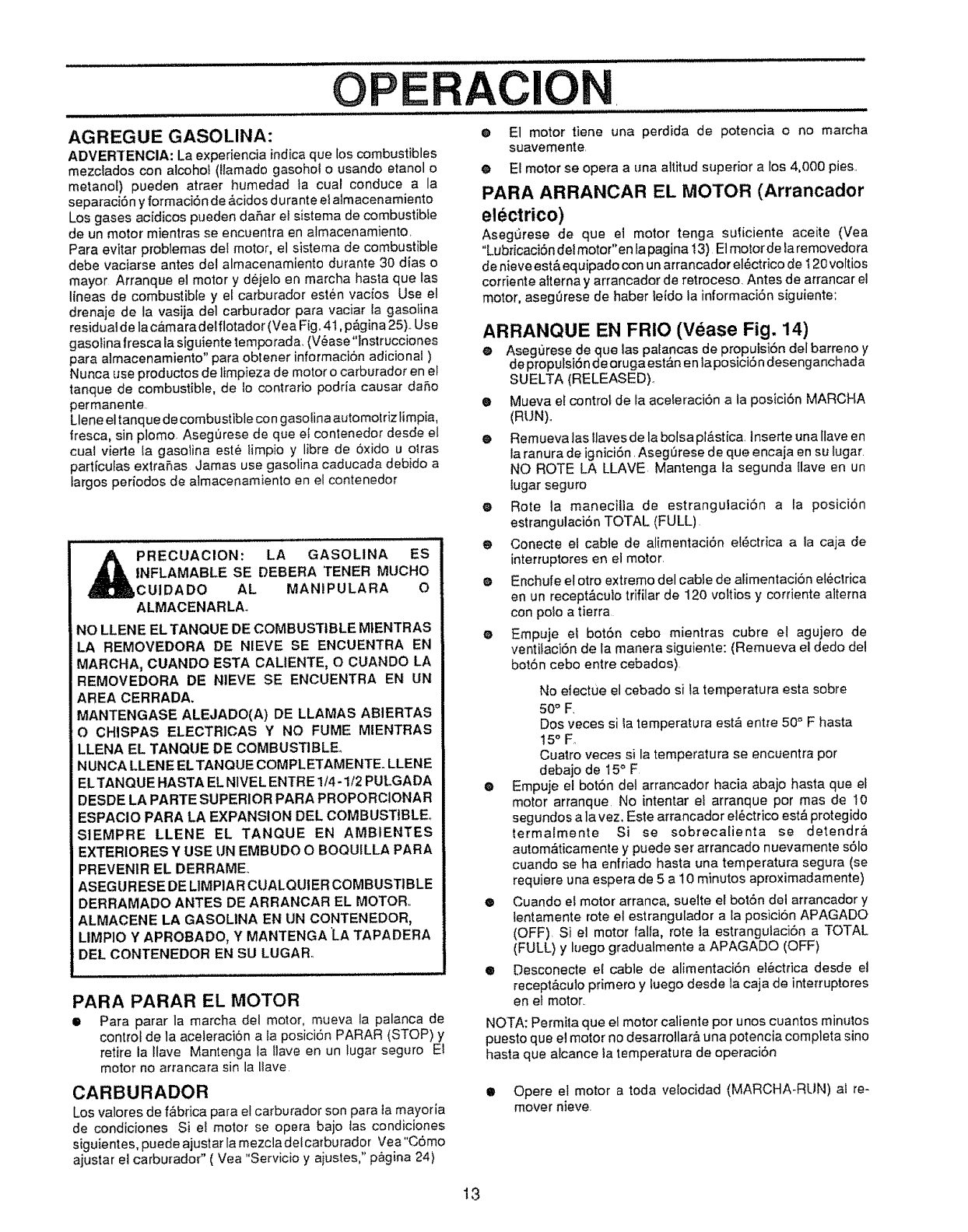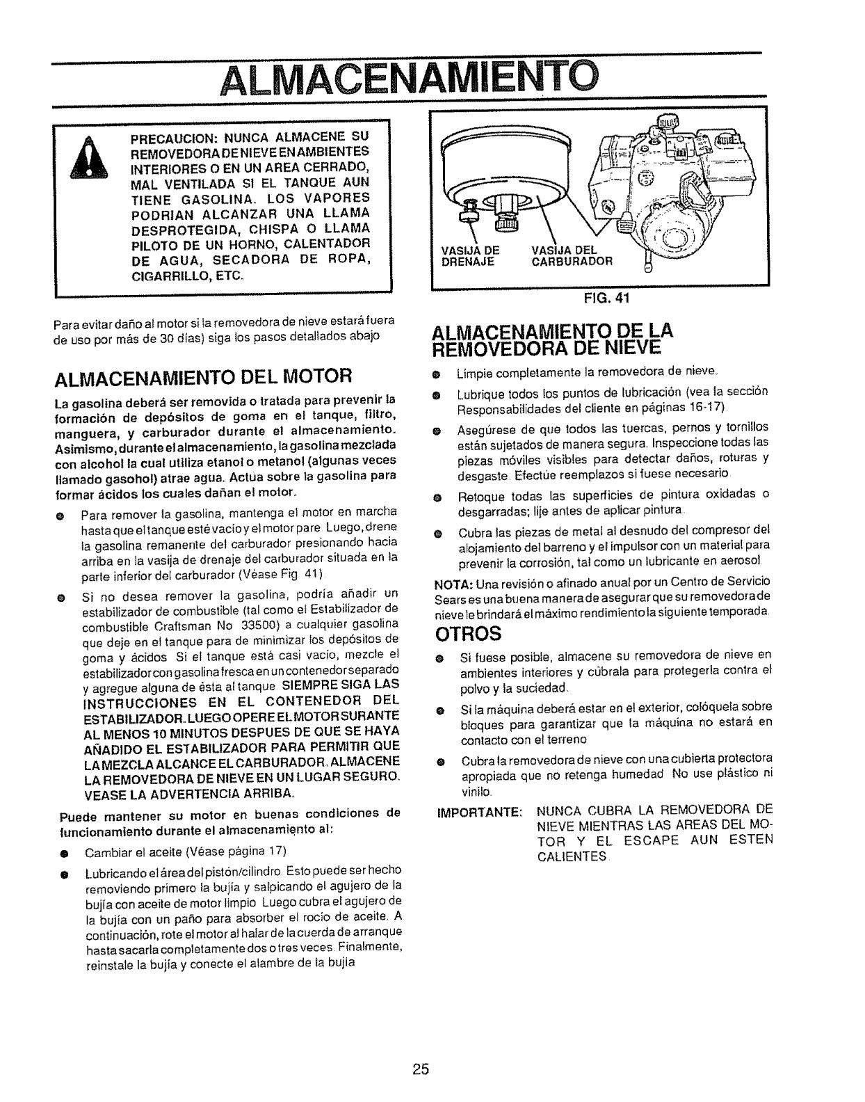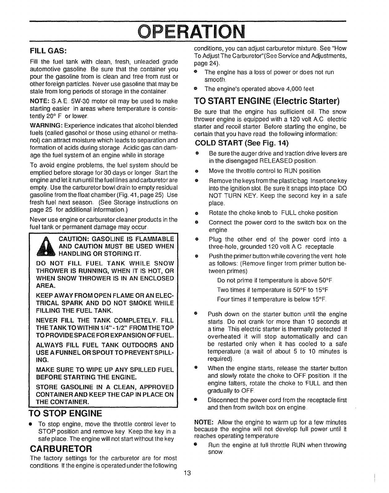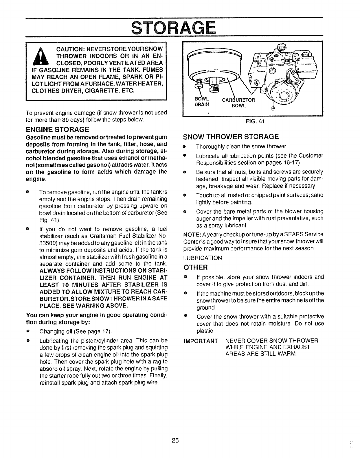 (e) Never store fuel or snow thrower with fuel in