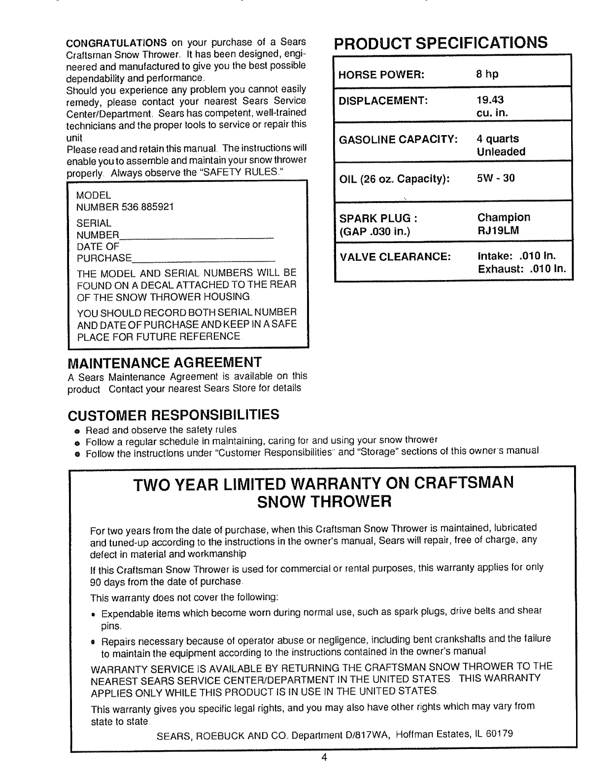 Craftsman 536885921 User Manual SNOW THROWER Manuals And Guides L0910368