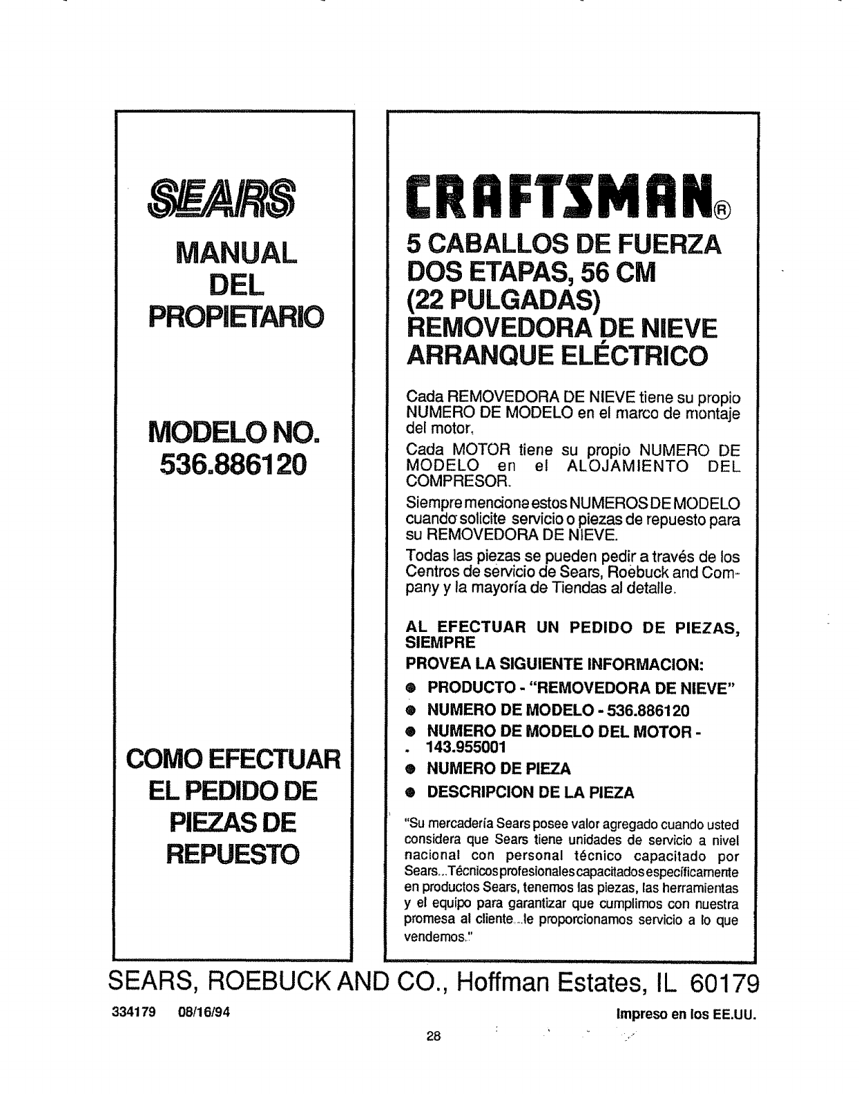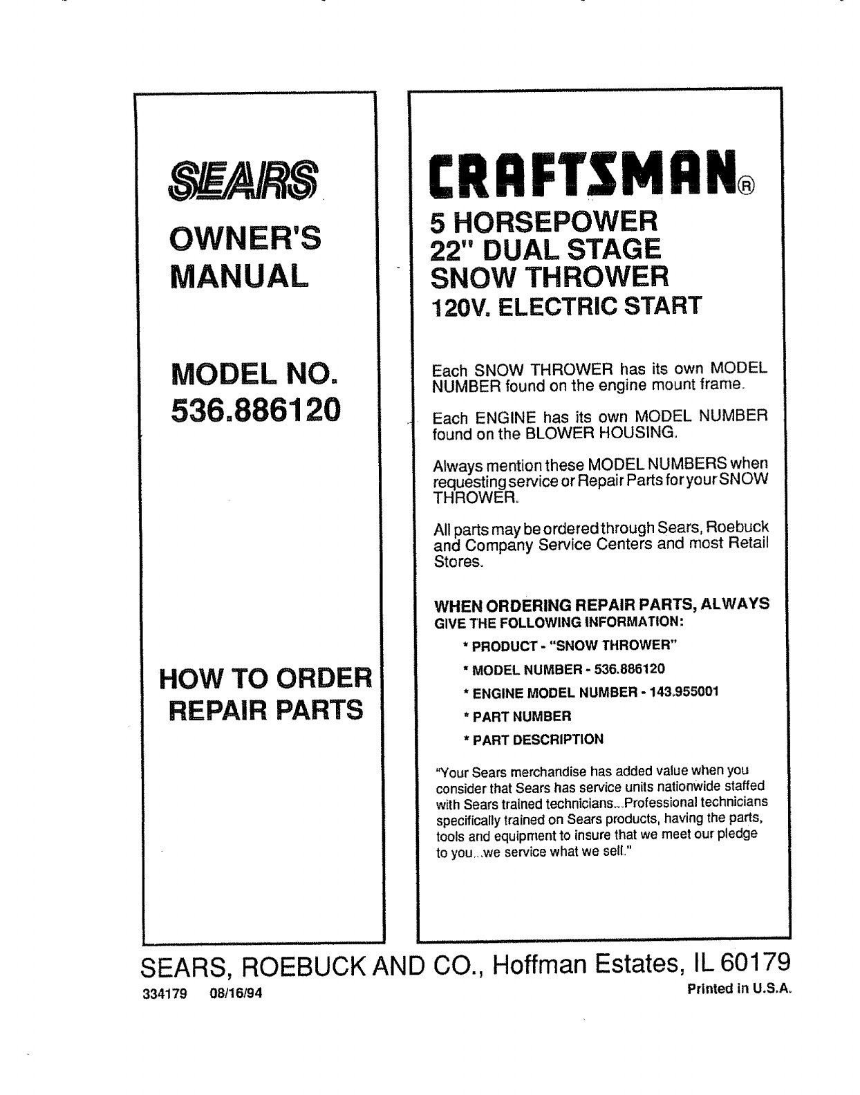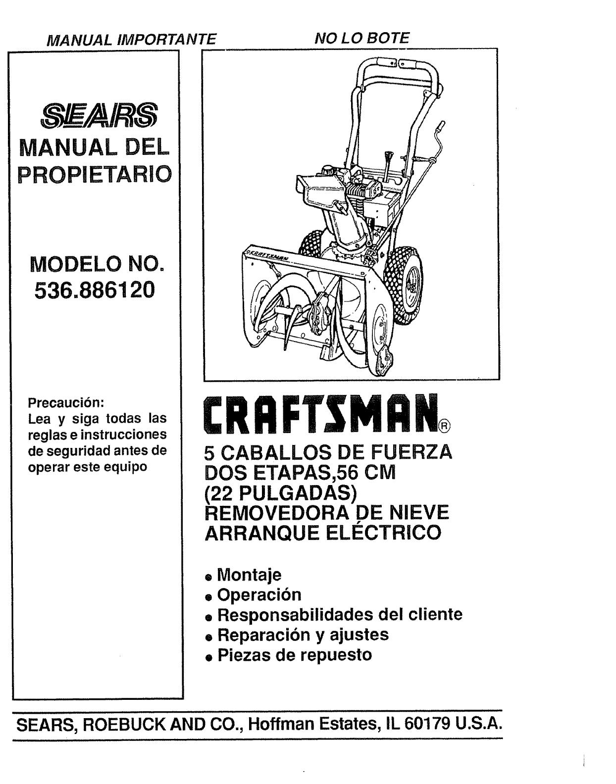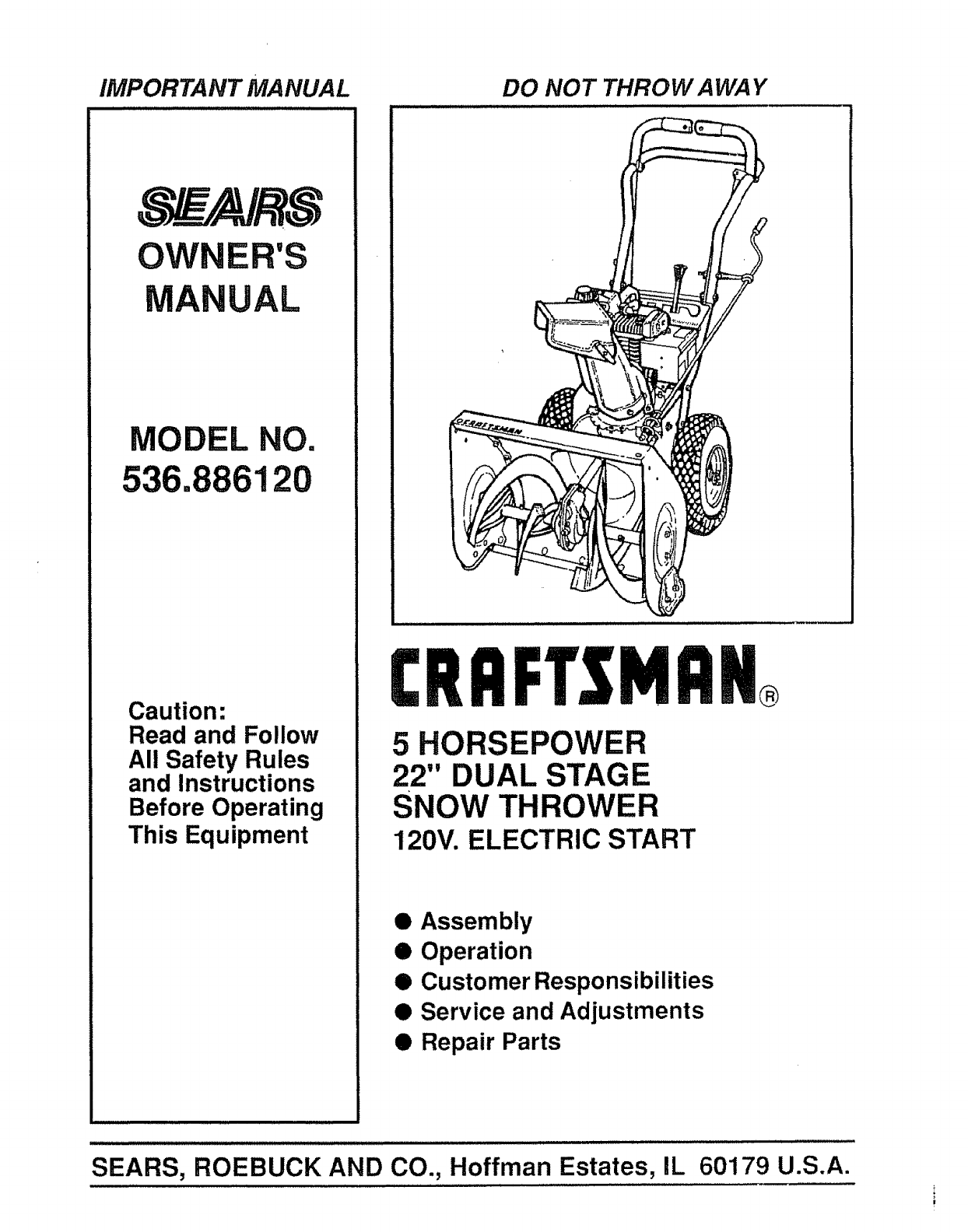 User Manual: Craftsman 536886120 536886120 CRAFTSMAN 5HP 22 SNOW THROWER - Manuals and Guides View the owners manual for your CRAFTSMAN 5HP 22 SNOW THROWER #536886120. Home:Lawn & Garden Parts:Craftsman Parts:Craftsman 5HP 22 SNOW THROWER Manual