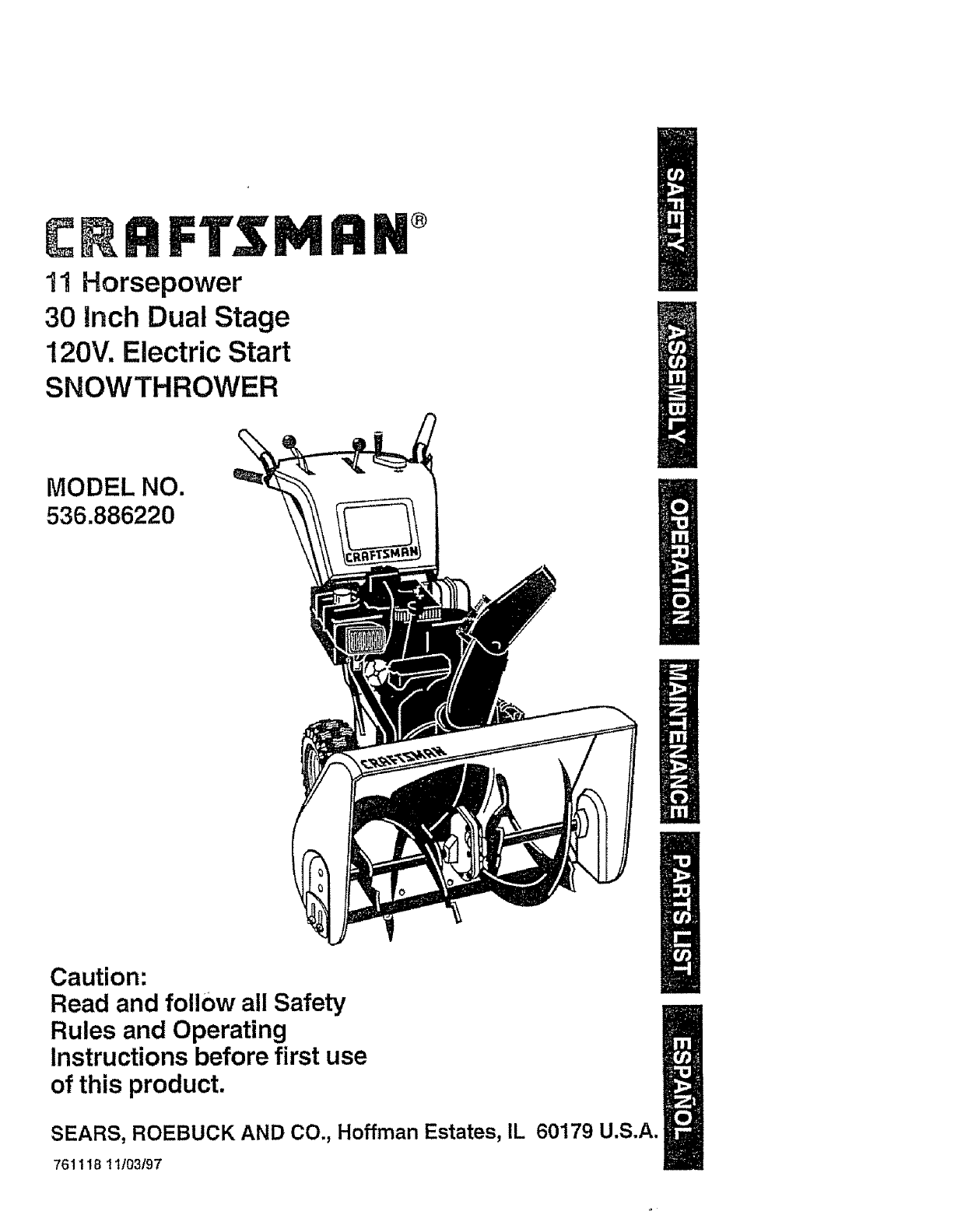User Manual: Craftsman 536886220 536886220 CRAFTSMAN SNOWTHROWER - Manuals and Guides View the owners manual for your CRAFTSMAN SNOWTHROWER #536886220. Home:Lawn & Garden Parts:Craftsman Parts:Craftsman SNOWTHROWER Manual