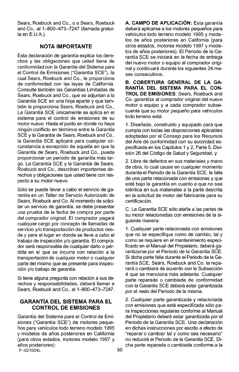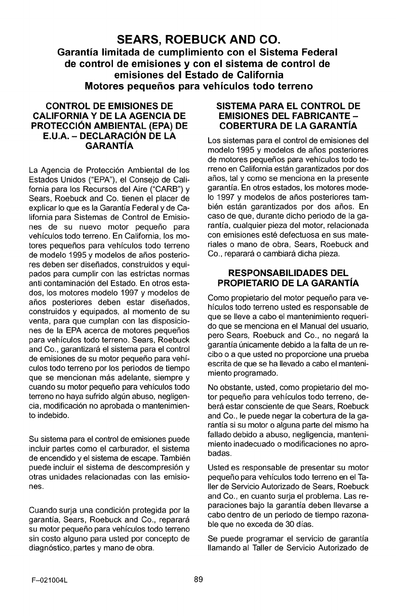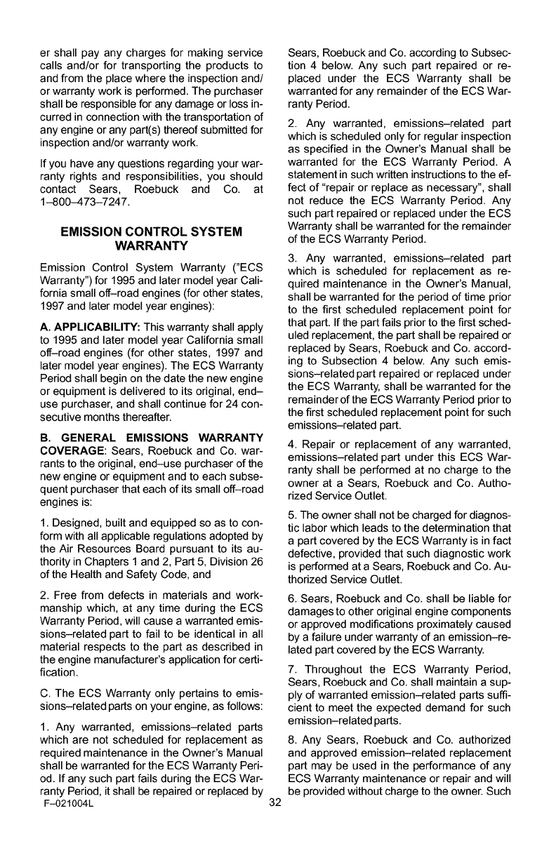 owner's manual, Sears will repair, free of charge, any defect in material or workmanship.