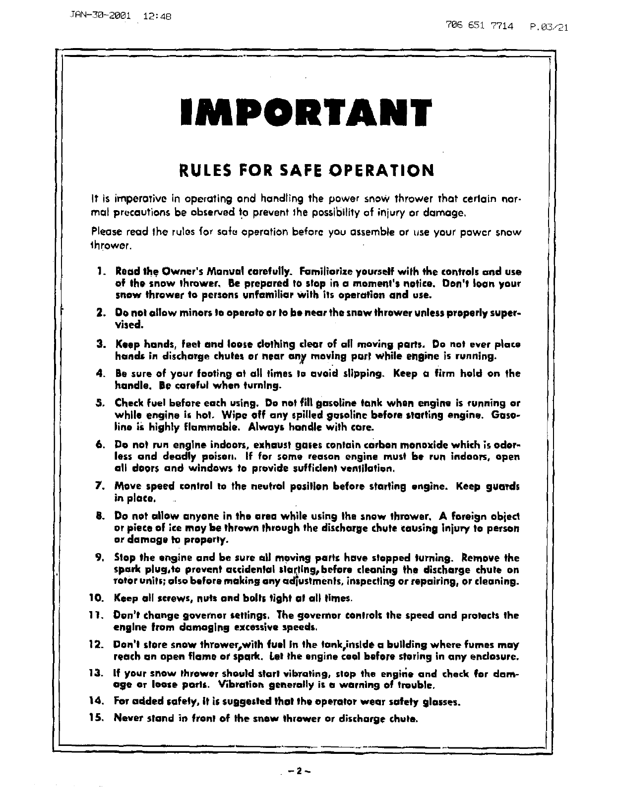 15. Never stand in front of the snow thrower or discharge chute.