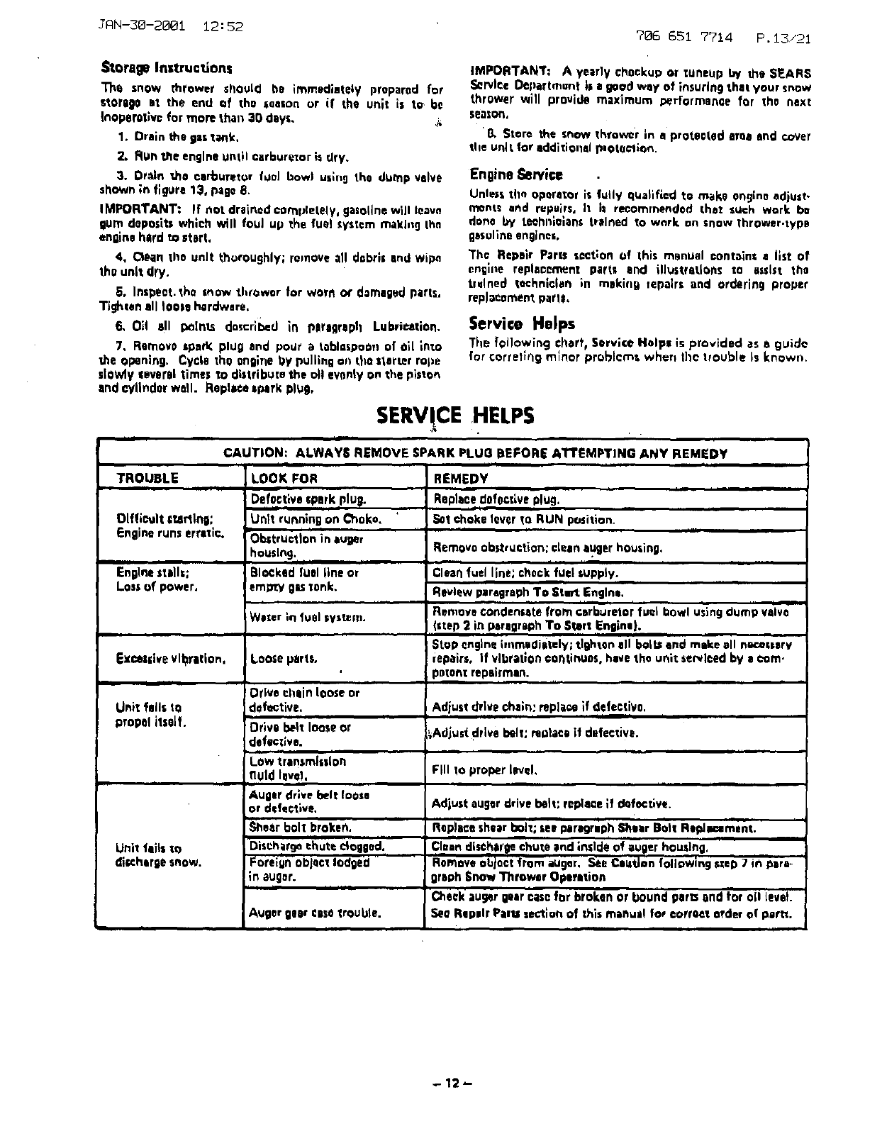 If your snow thrower should start vibrating, slop the englne and check for dam-