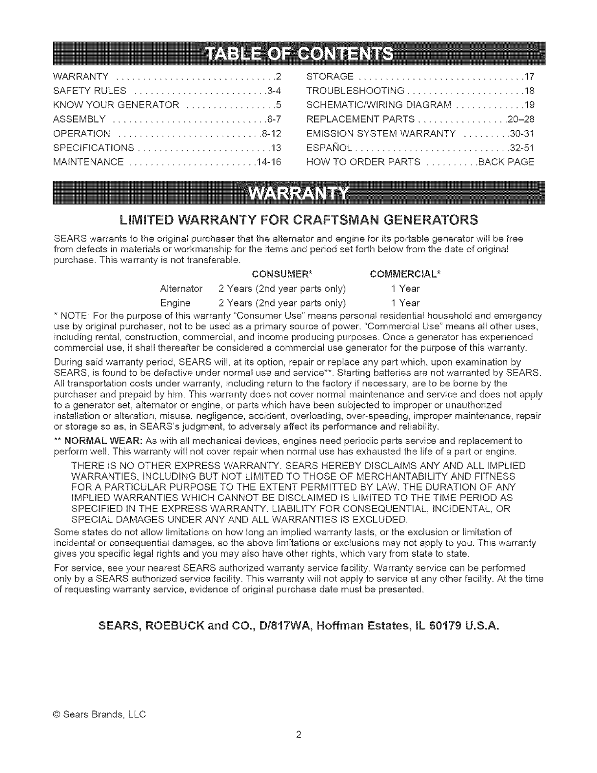 LIMtTED WARRANTY FOR CRAFTSMAN GENERATORS