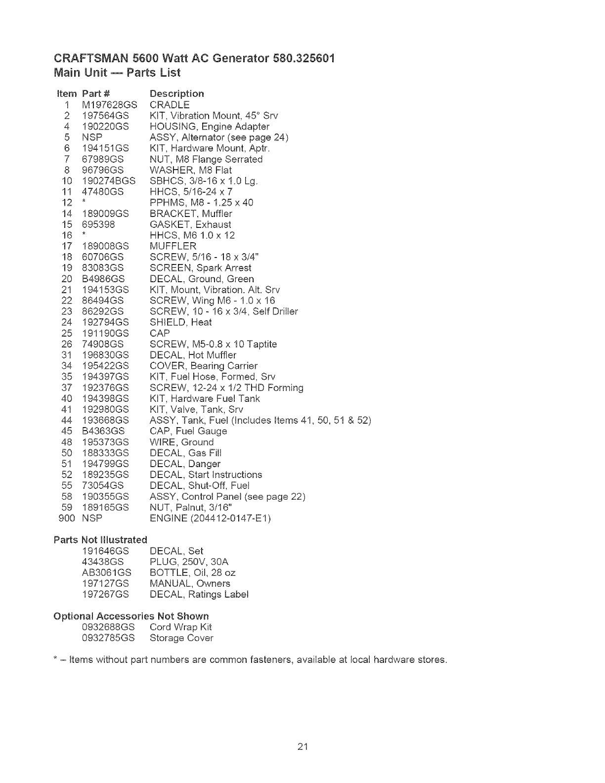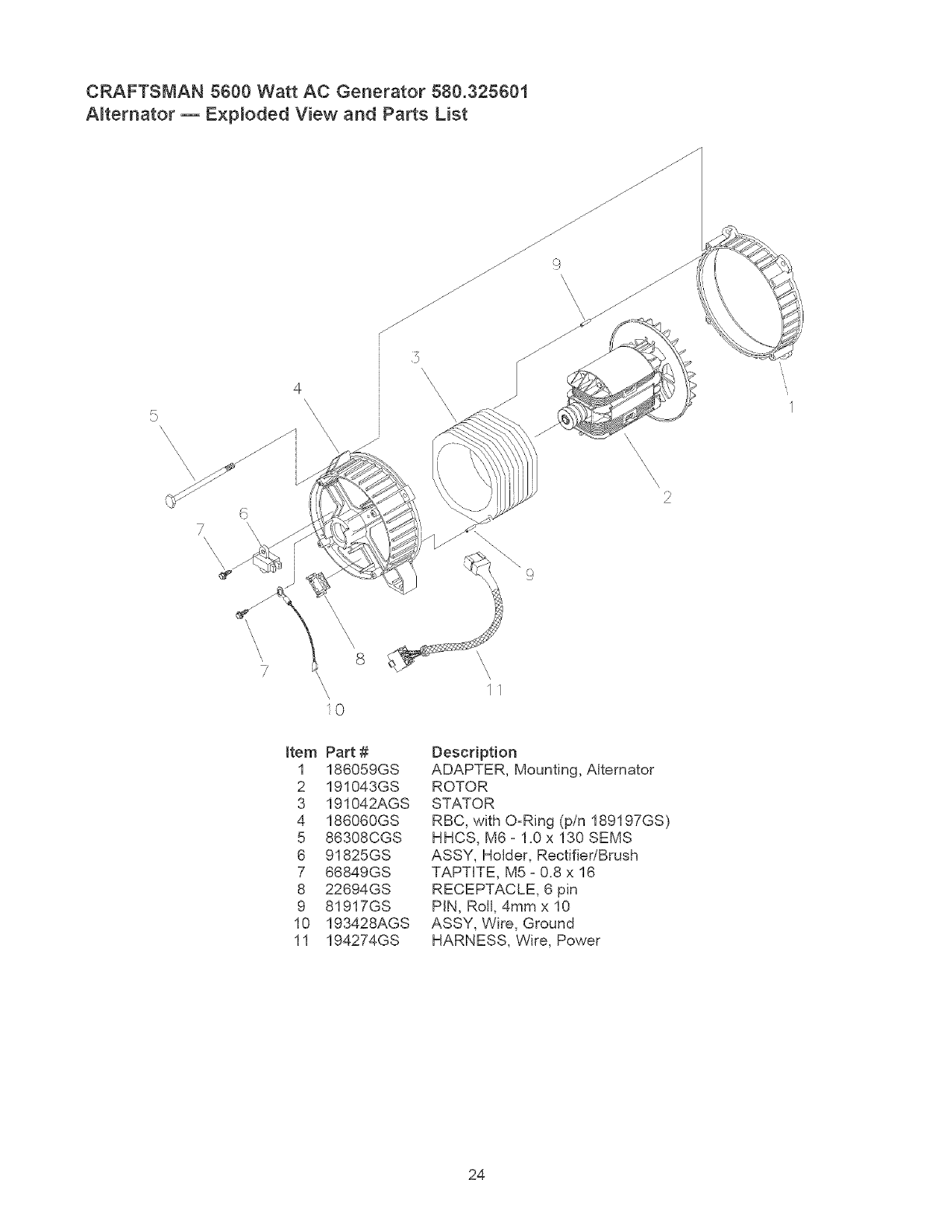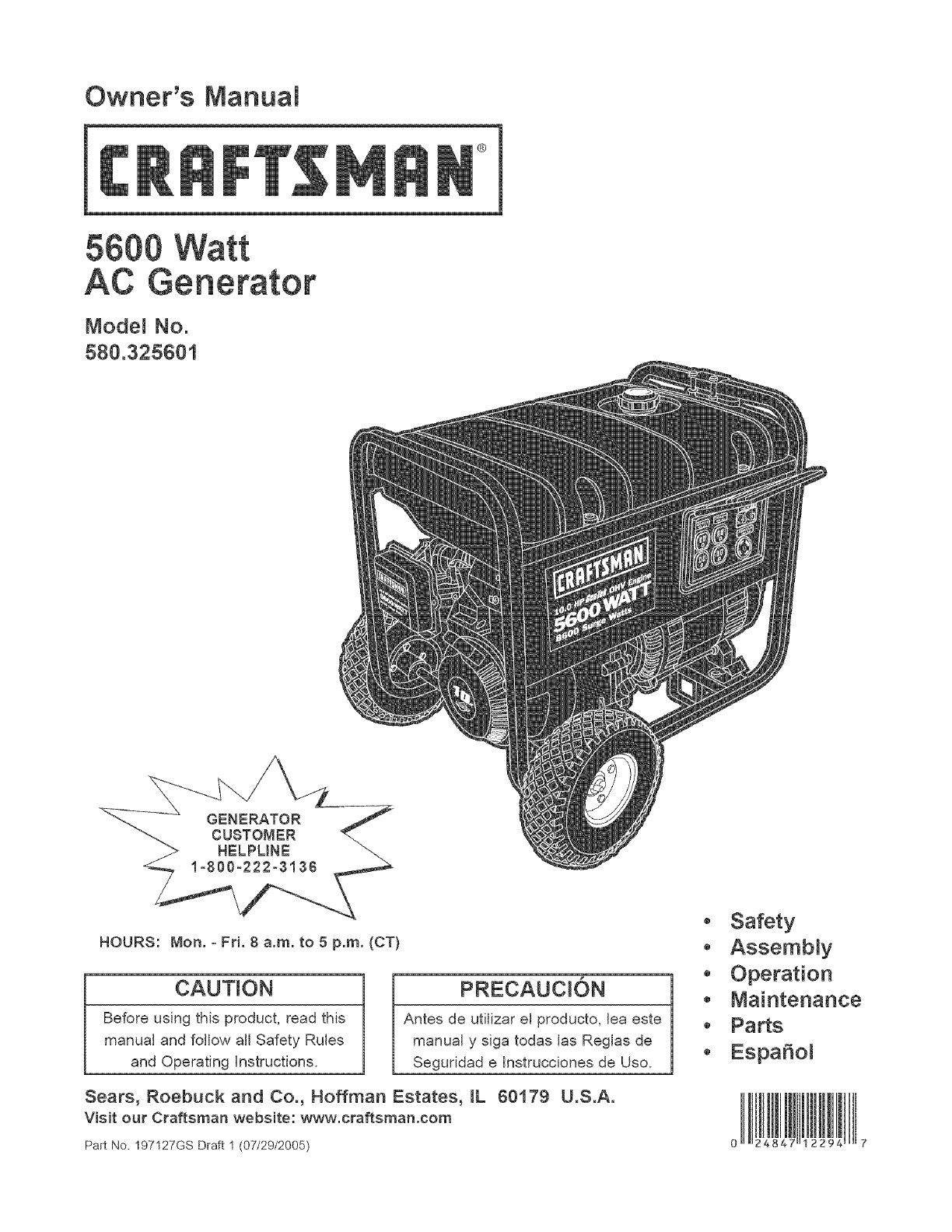 User Manual: Craftsman 580325601 580325601 CRAFTSMAN AC GENERATOR - Manuals and Guides View the owners manual for your CRAFTSMAN AC GENERATOR #580325601. Home:Tool Parts:Craftsman Parts:Craftsman AC GENERATOR Manual