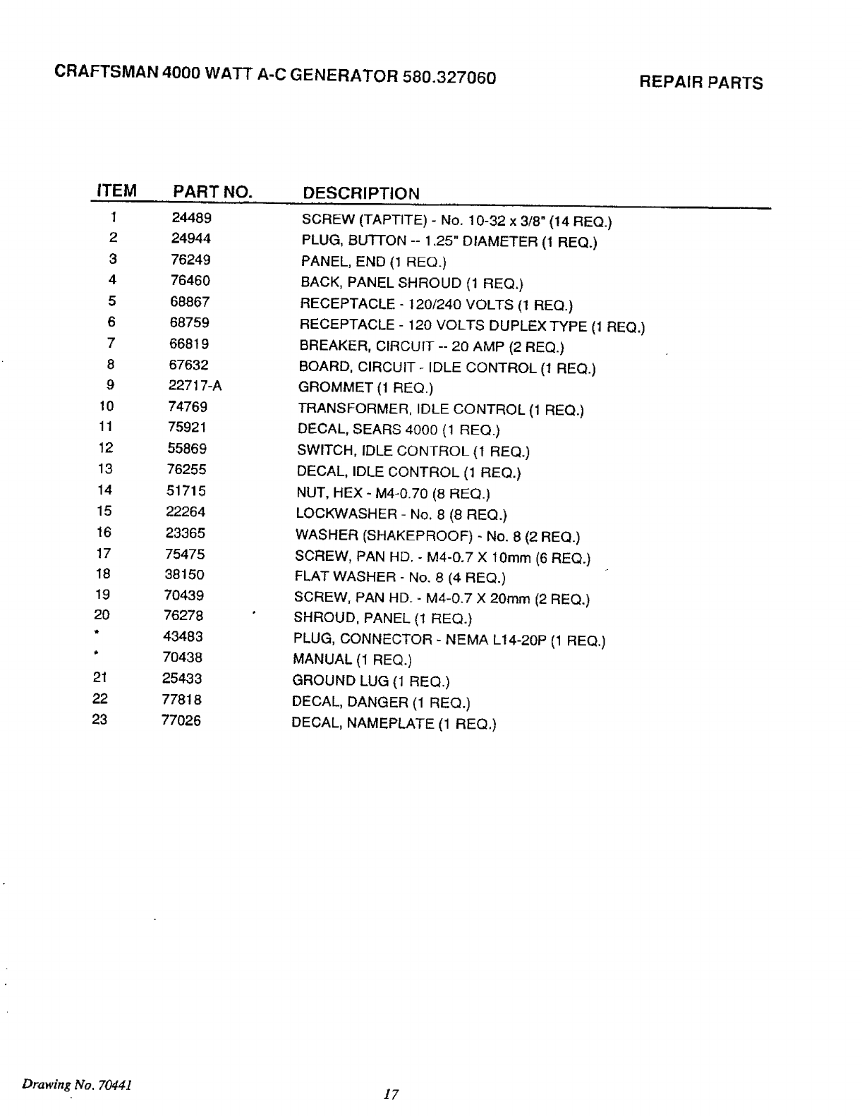 User Manual: Craftsman 580327060 580327060 CRAFTSMAN GENERATOR - Manuals and Guides View the owners manual for your CRAFTSMAN GENERATOR #580327060. Home:Tool Parts:Craftsman Parts:Craftsman GENERATOR Manual