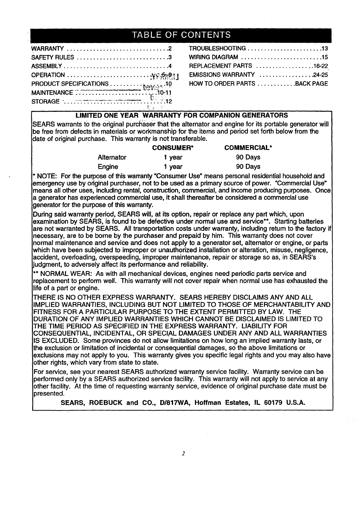 SEARS warrants tO the Originalpurcl_aser that the alternator and engine for its portable generator will