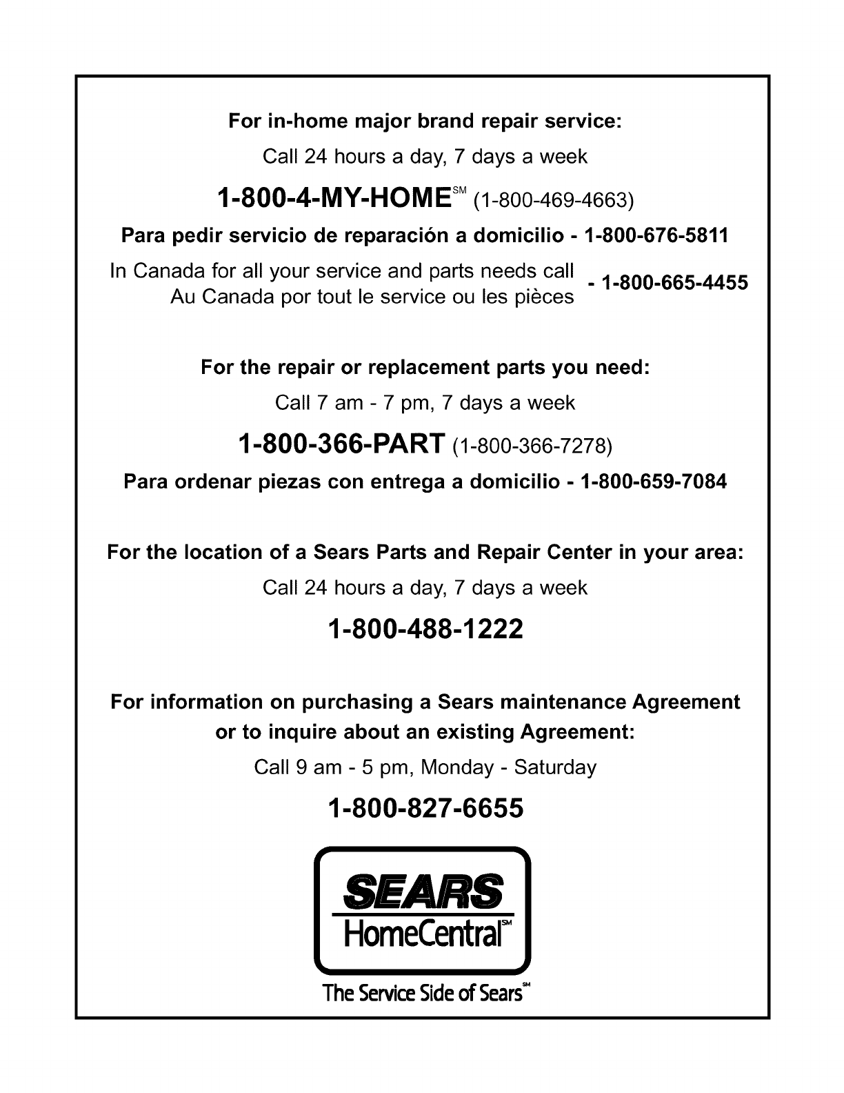 For service, see your nearest SEARS authorized warranty service facility. Warranty service can be performed