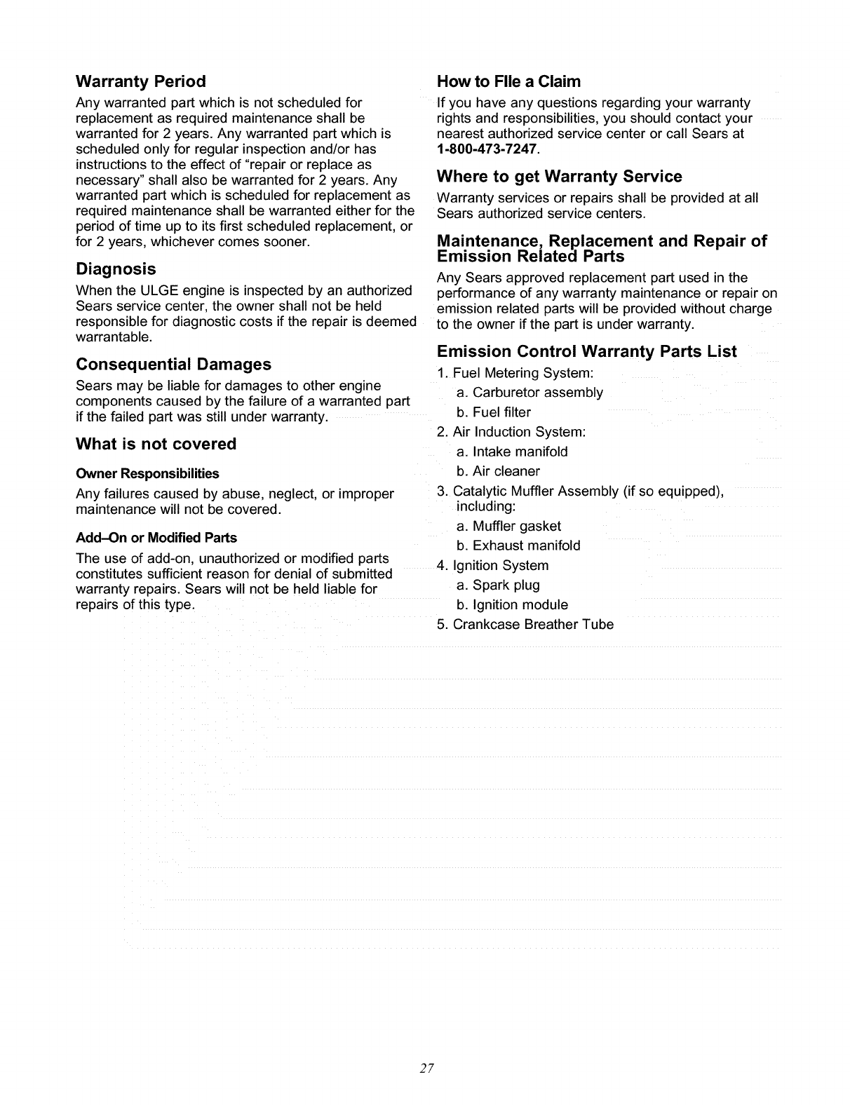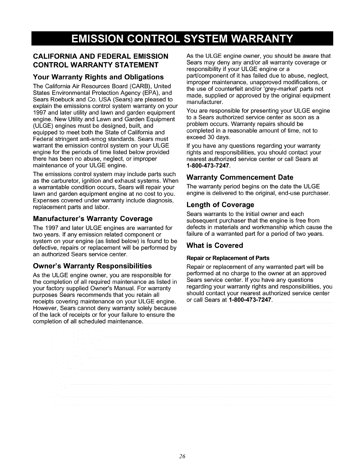 found to be defective under normal use and service**. Starting batteries are not warranted by SEARS. All transportation