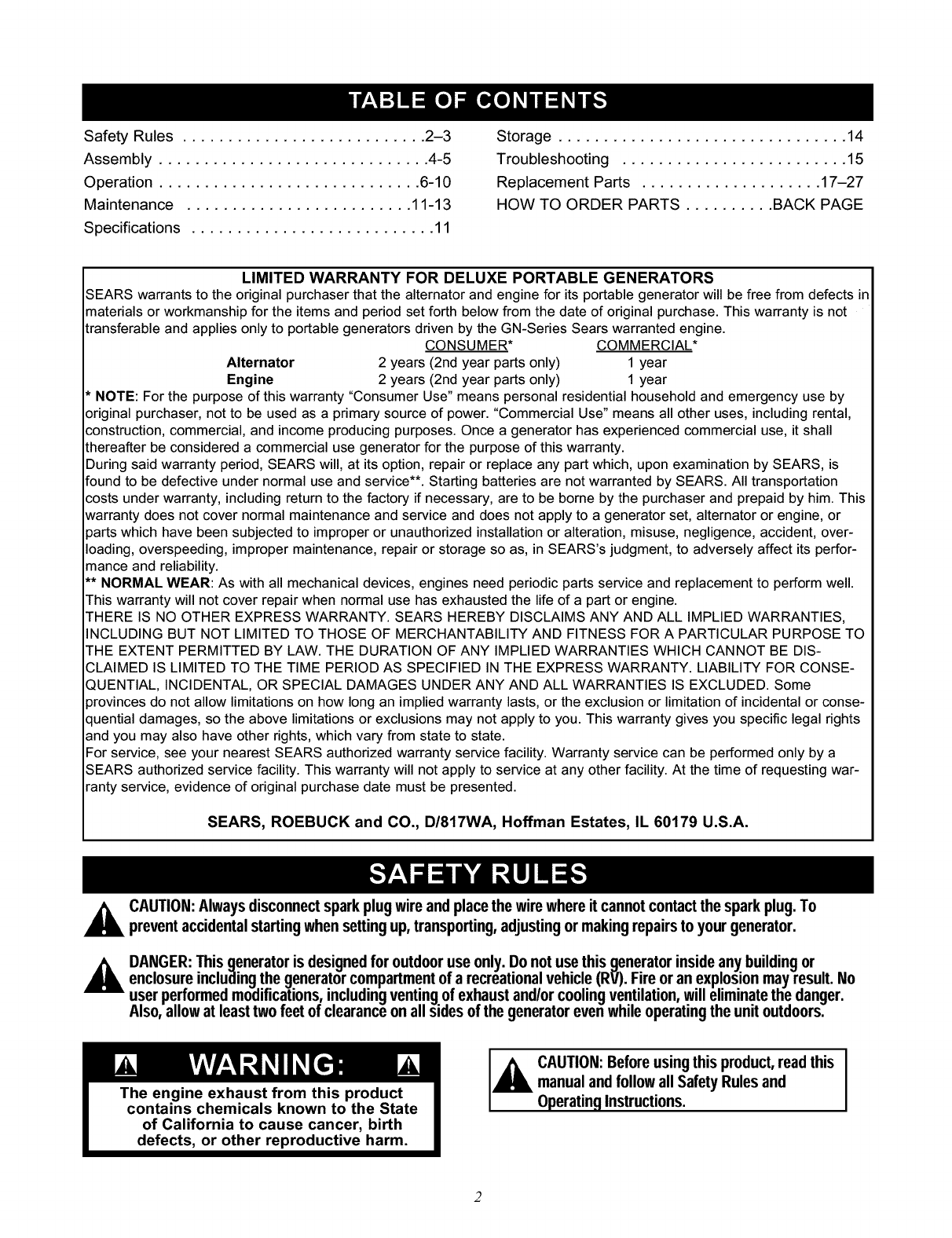 CRAFTSMAN Generator Manual L0208247 CRAFTSMAN Generator Owner's Manual, CRAFTSMAN Generator installation guides