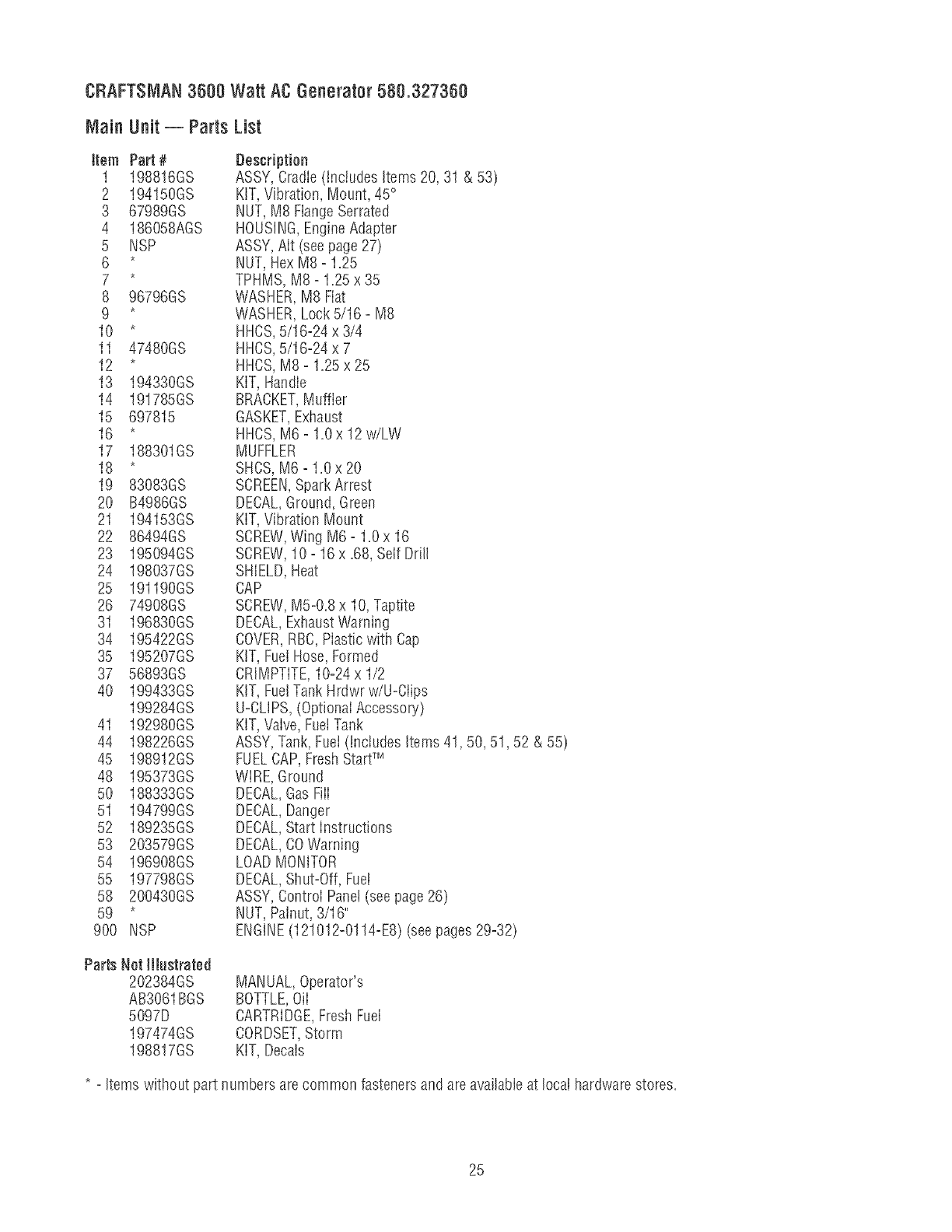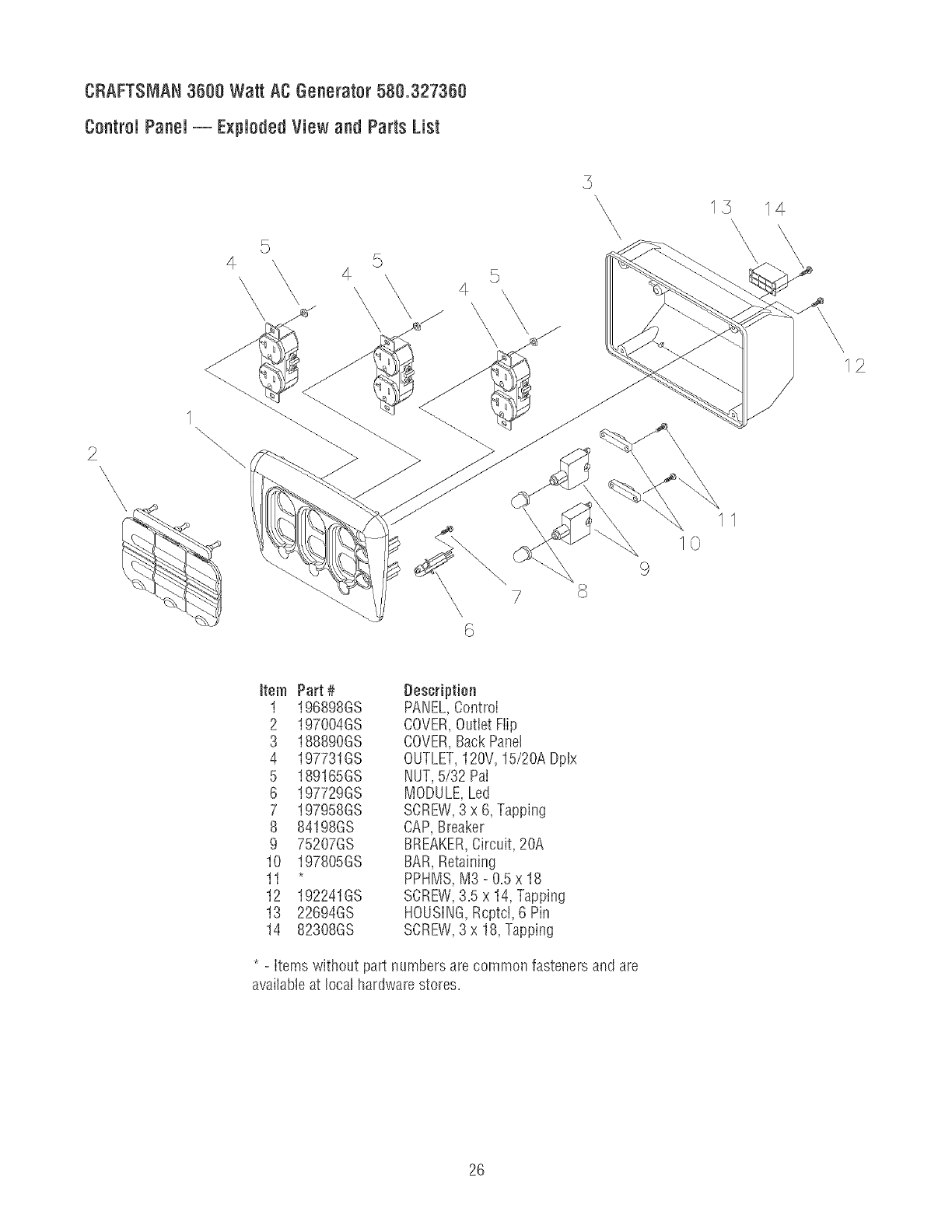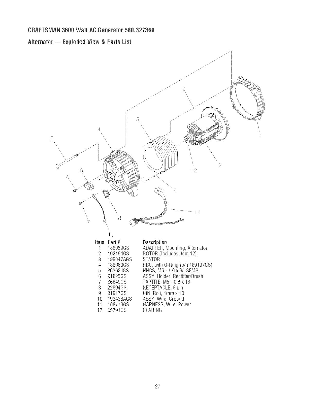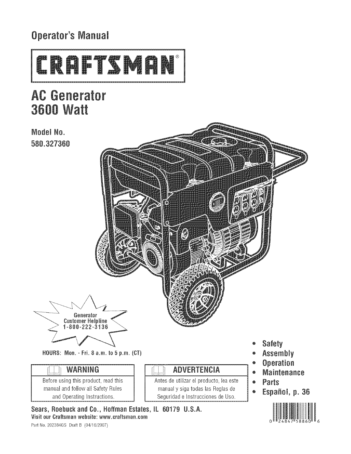 User Manual: Craftsman 580327360 580327360 CRAFTSMAN GENERATOR - Manuals and Guides View the owners manual for your CRAFTSMAN GENERATOR #580327360. Home:Tool Parts:Craftsman Parts:Craftsman GENERATOR Manual