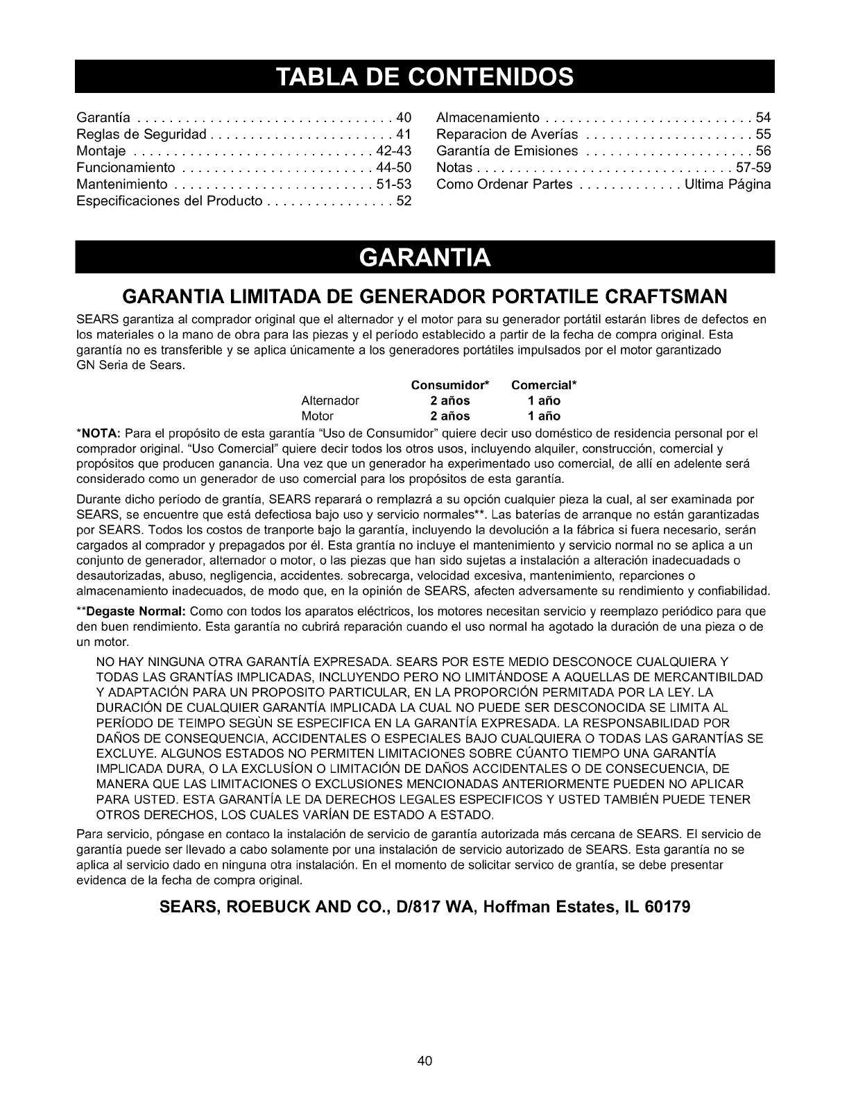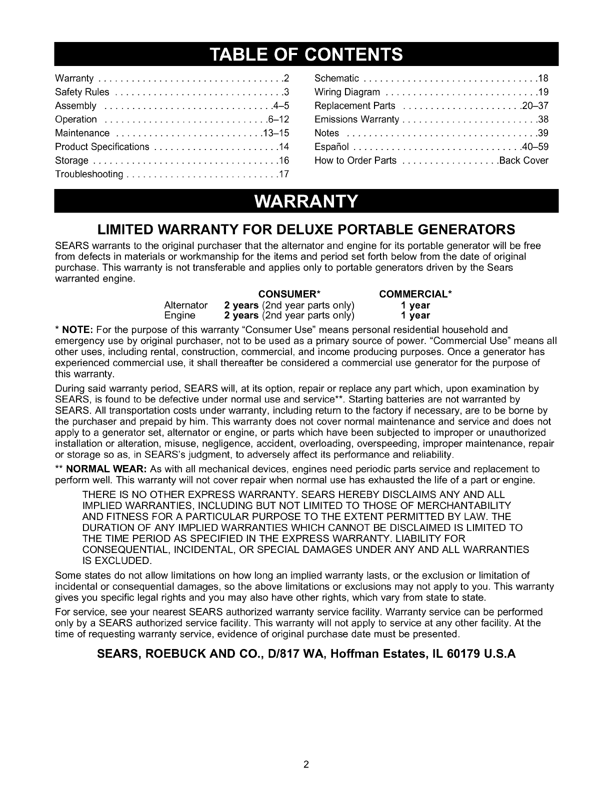 SEARS warrants to the original purchaser that the alternator and engine for its portable generator will be free