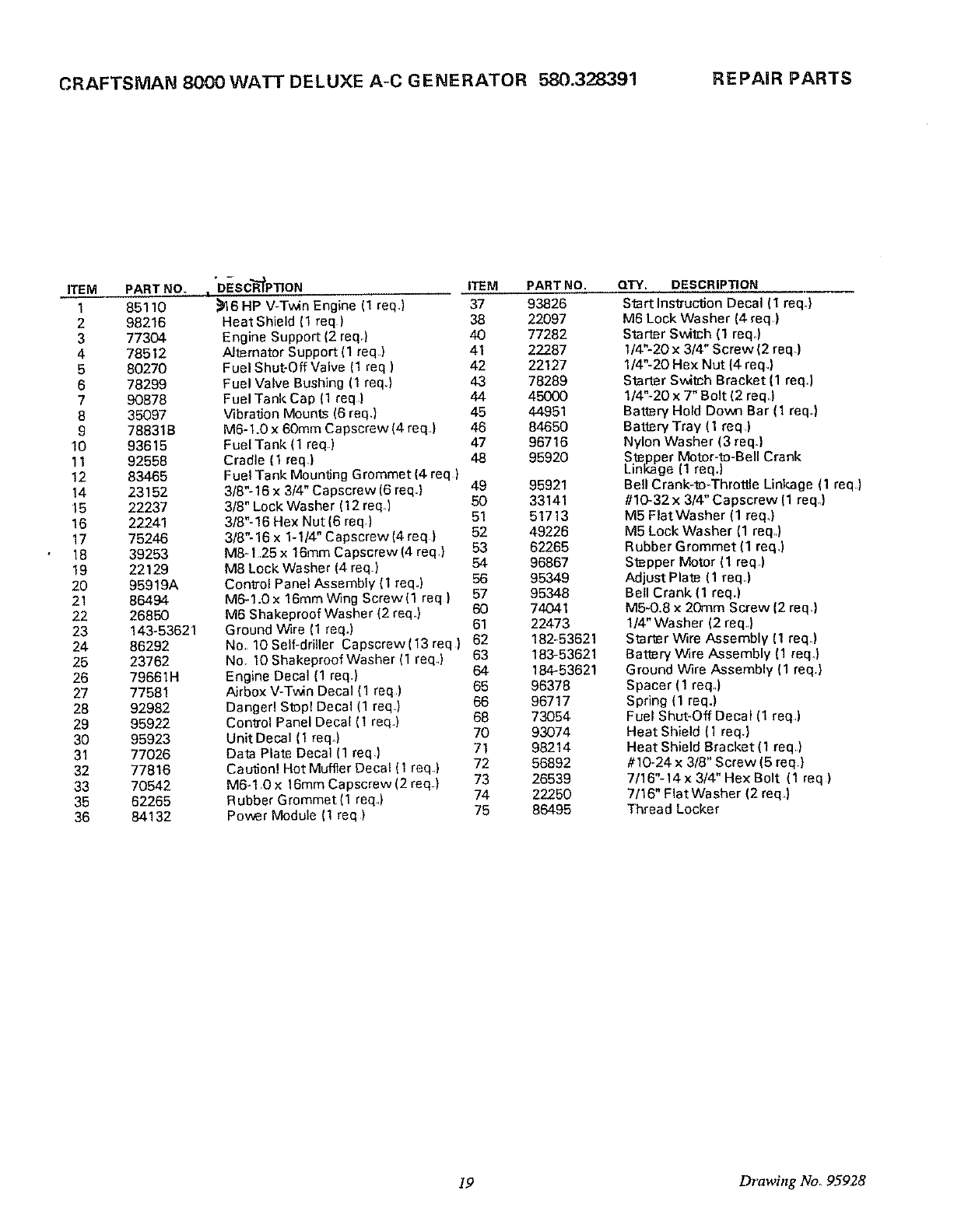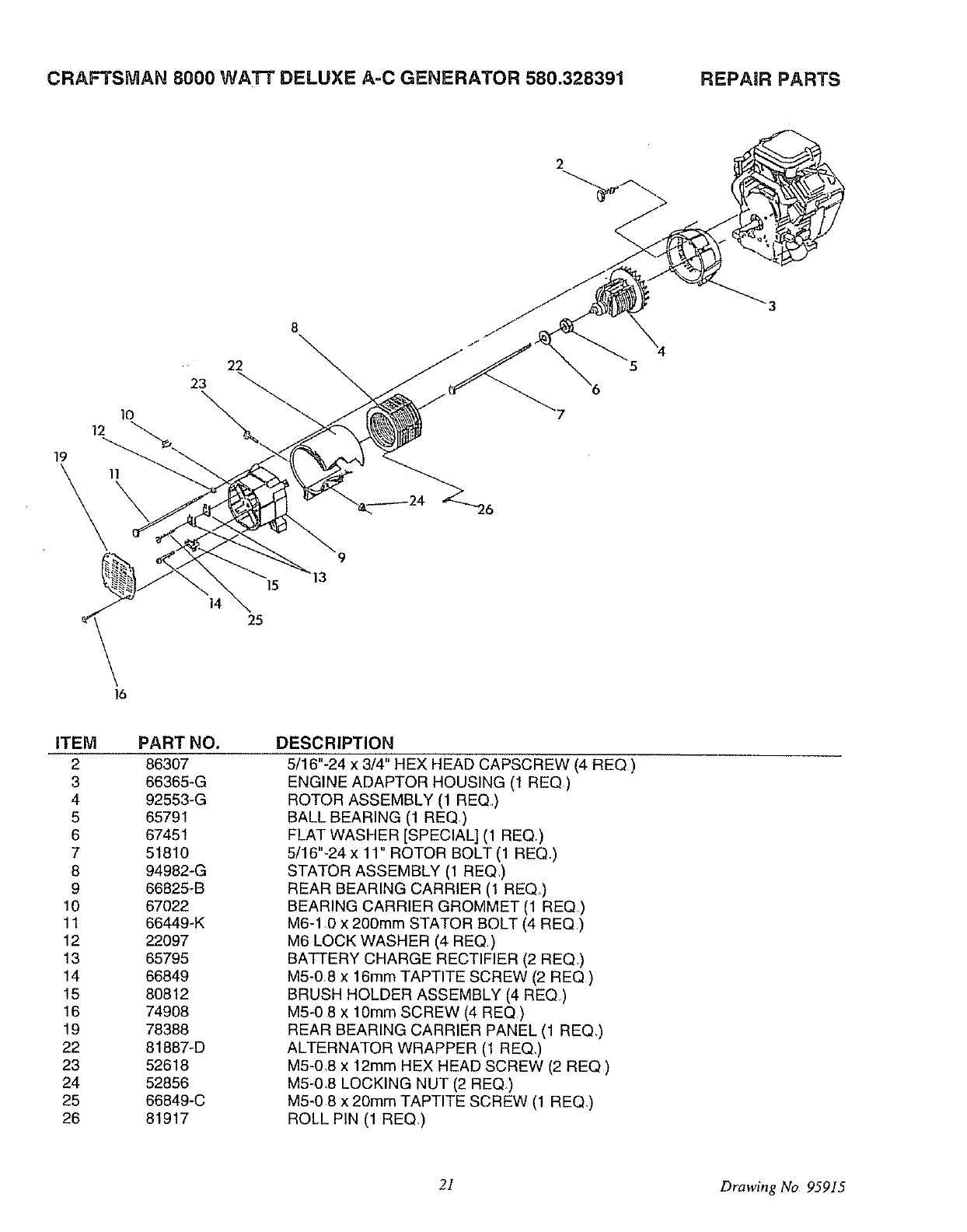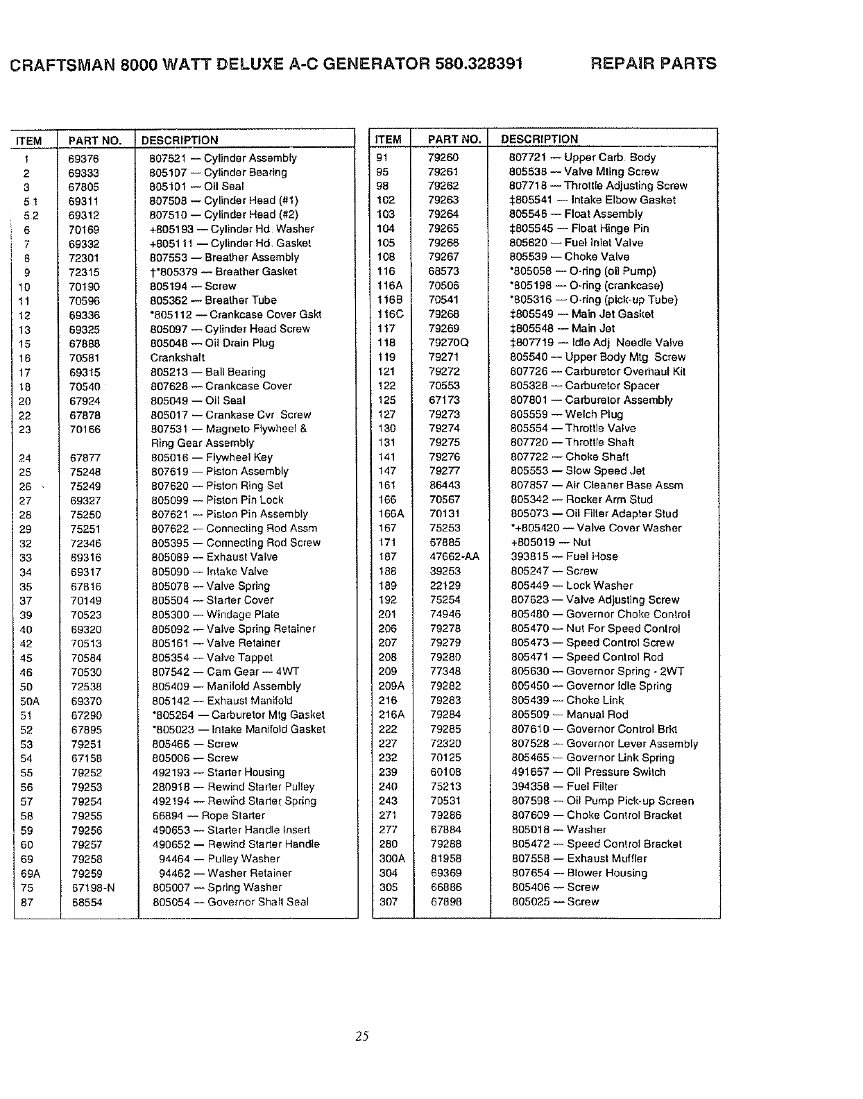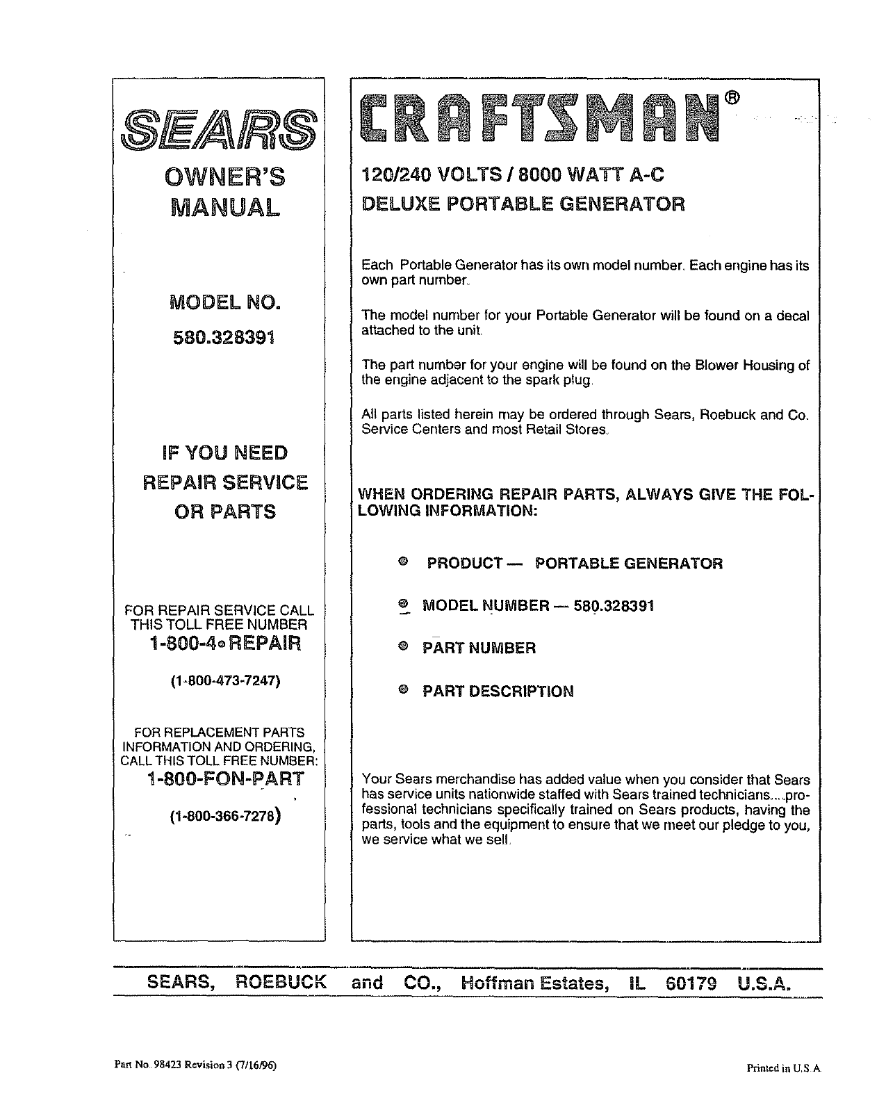User Manual: Craftsman 580328391 580328391 CRAFTSMAN GENERATOR - Manuals and Guides View the owners manual for your CRAFTSMAN GENERATOR #580328391. Home:Tool Parts:Craftsman Parts:Craftsman GENERATOR Manual
