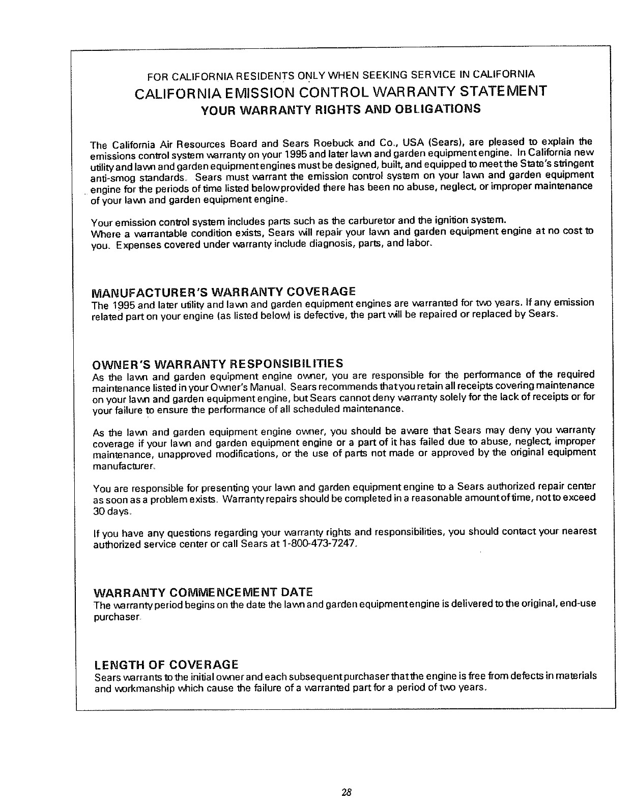 on your lav_ and garden equipment engine, but Sears cannot deny warranty solely for the lack of receipts or for