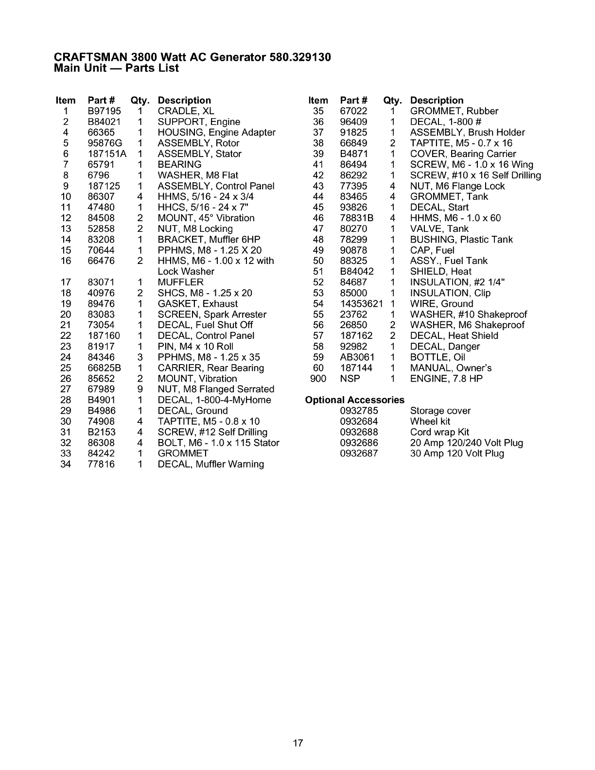 User Manual: Craftsman 580329130 580329130 CRAFTSMAN GENERATOR - Manuals and Guides View the owners manual for your CRAFTSMAN GENERATOR #580329130. Home:Tool Parts:Craftsman Parts:Craftsman GENERATOR Manual