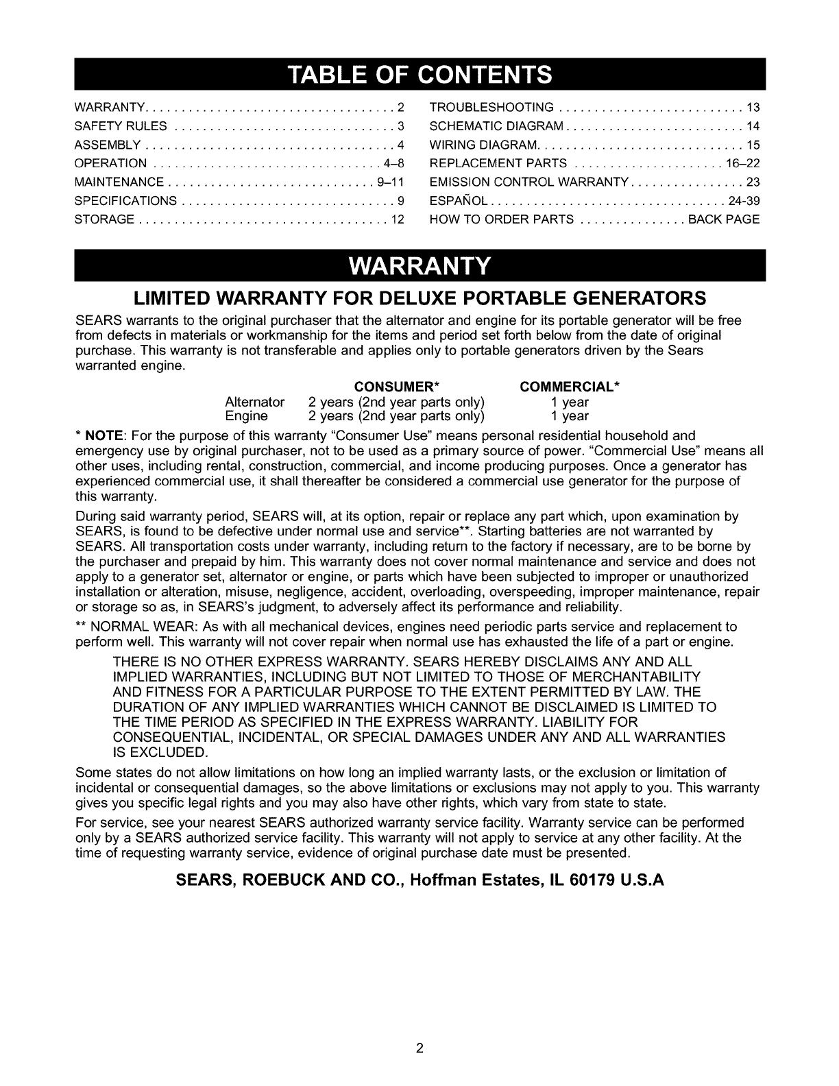 SEARS warrants to the original purchaser that the alternator and engine for its portable generator will be free