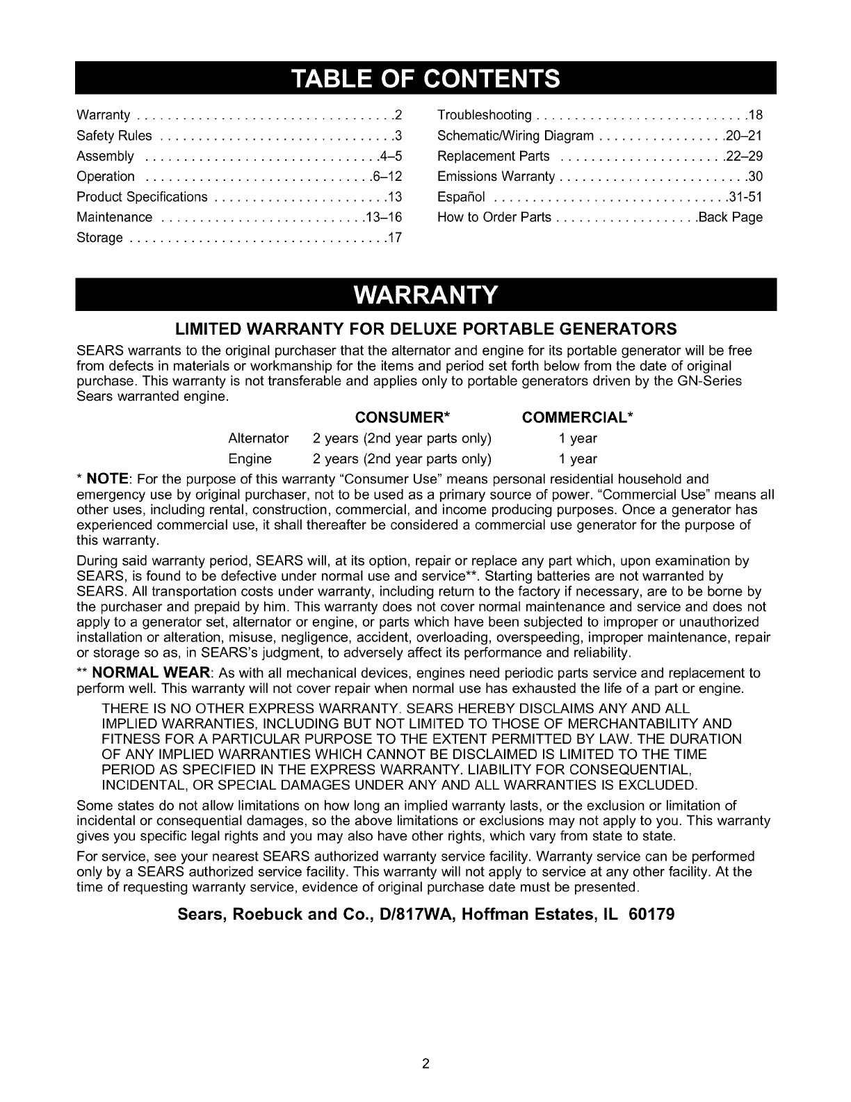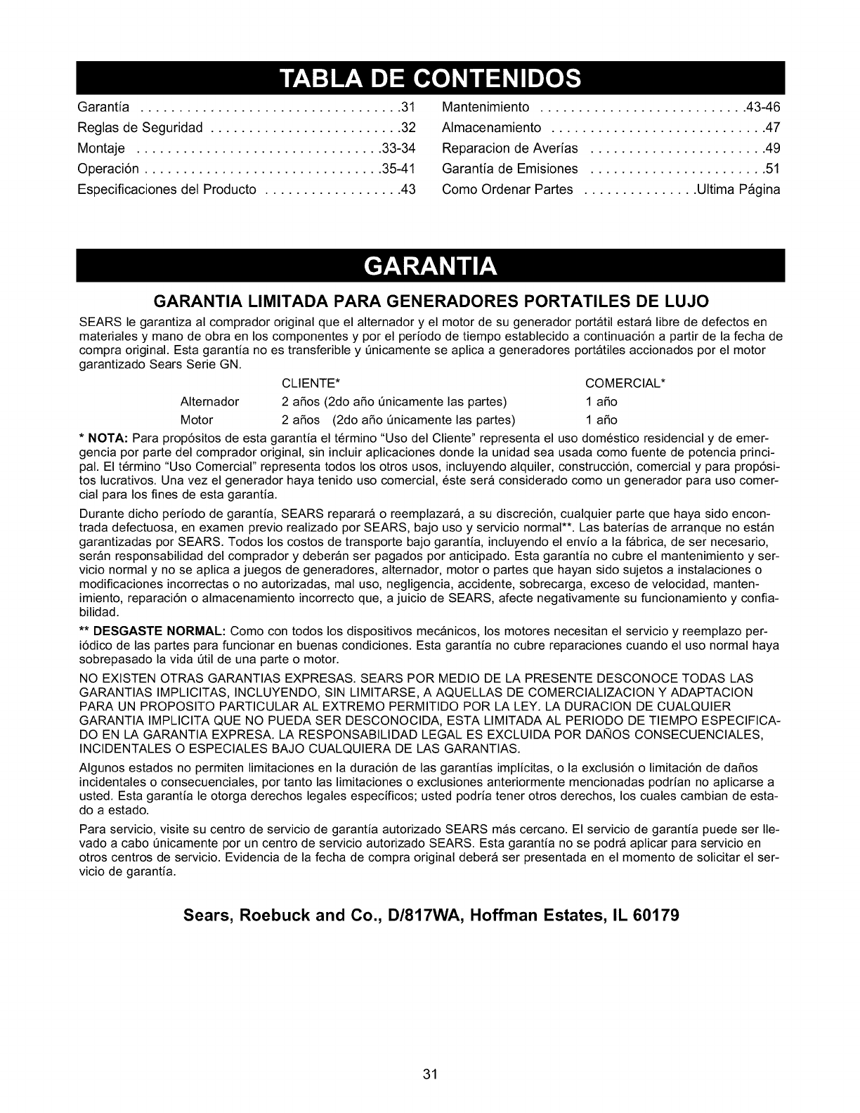 SEARS warrants to the original purchaser that the alternator and engine for its portable generator will be free