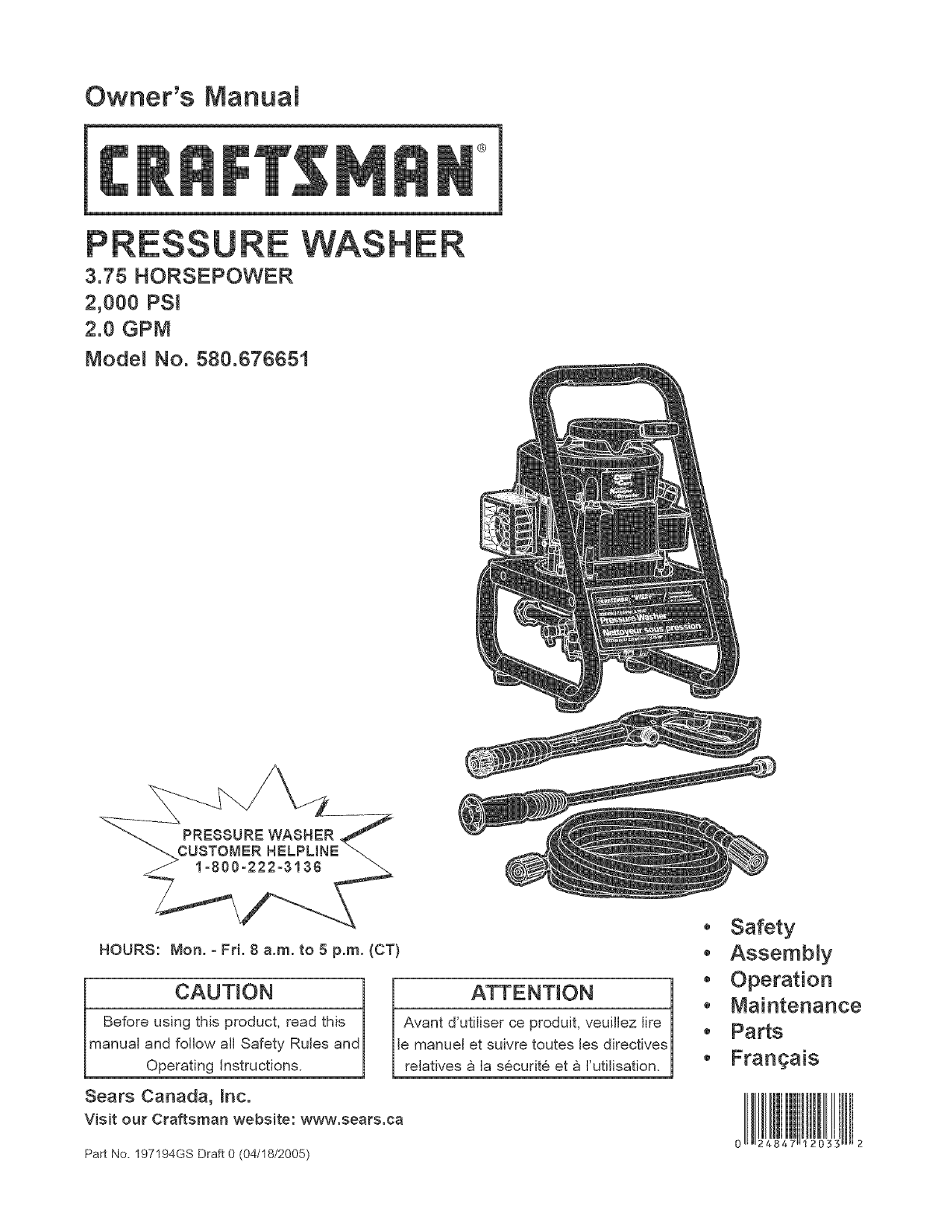 User Manual: Craftsman 580676651 580676651 CRAFTSMAN PRESSURE WASHER - Manuals and Guides View the owners manual for your CRAFTSMAN PRESSURE WASHER #580676651. Home:Lawn & Garden Parts:Craftsman Parts:Craftsman PRESSURE WASHER Manual