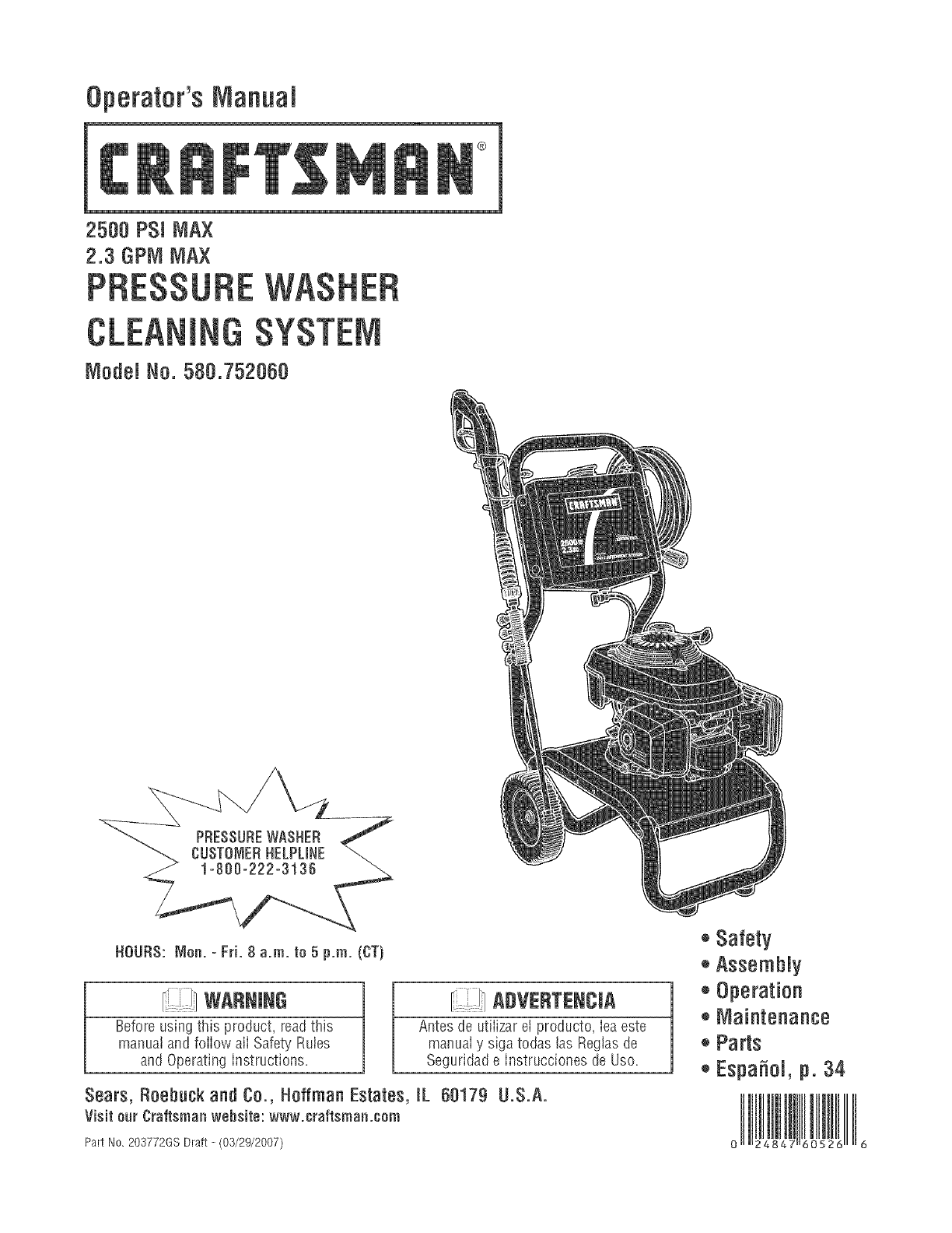 User Manual: Craftsman 580752060 580752060 CRAFTSMAN PRESSURE WASHER - Manuals and Guides View the owners manual for your CRAFTSMAN PRESSURE WASHER #580752060. Home:Lawn & Garden Parts:Craftsman Parts:Craftsman PRESSURE WASHER Manual