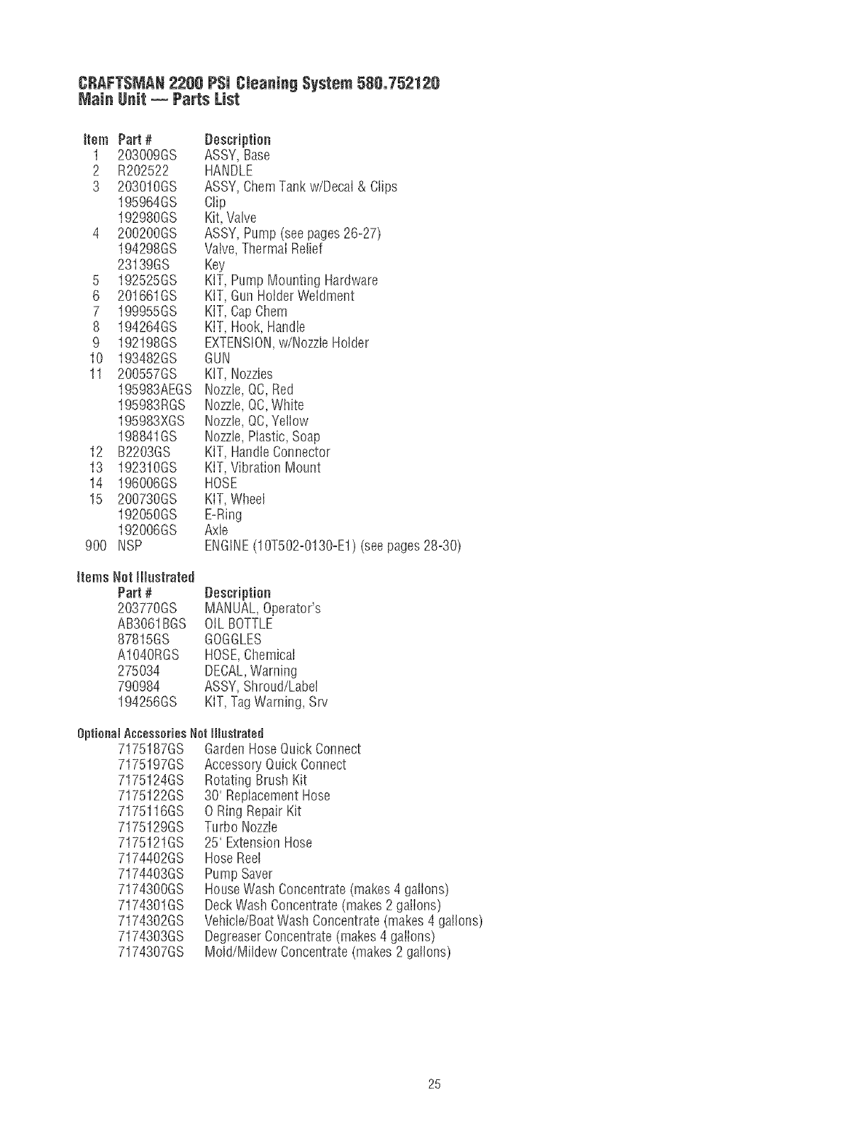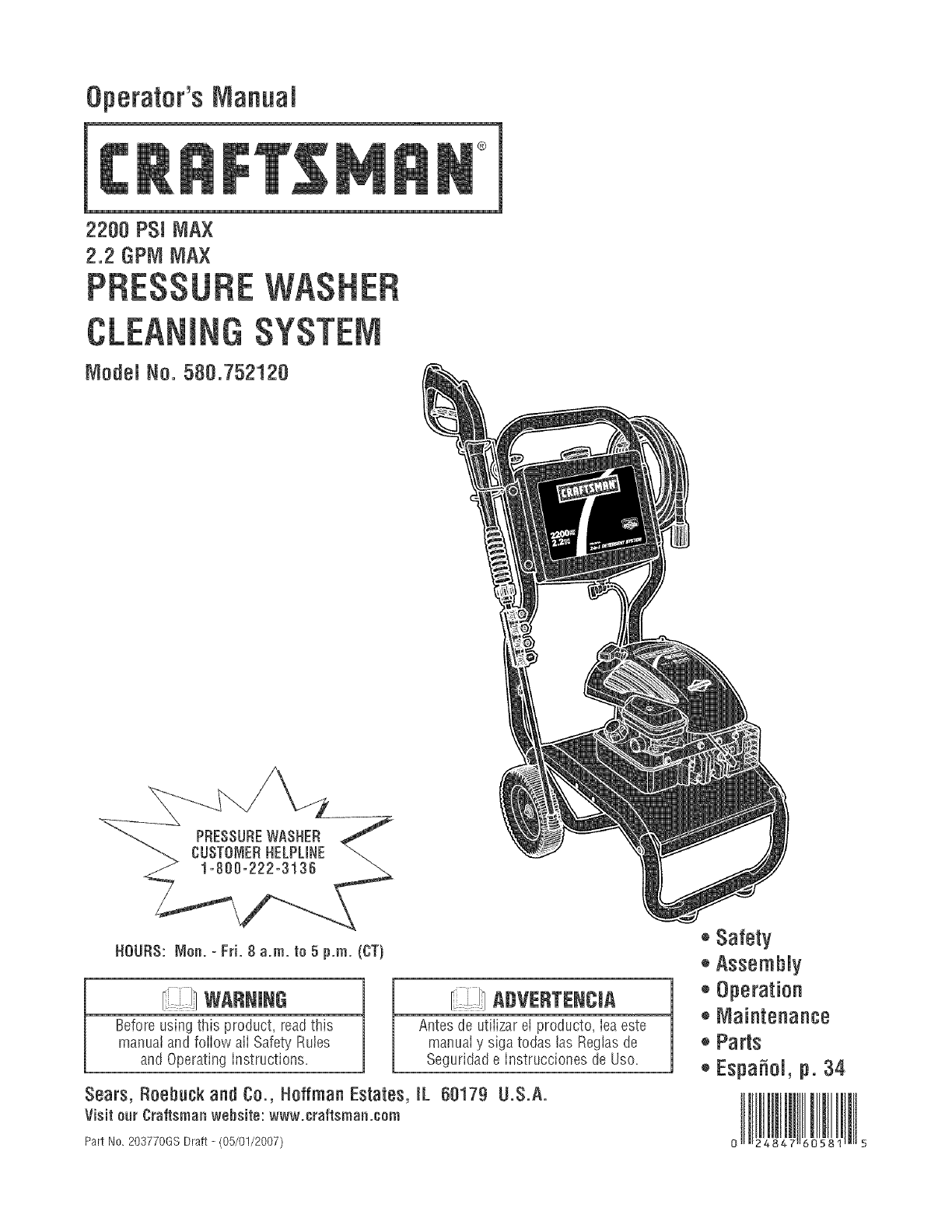 User Manual: Craftsman 580752120 580752120 CRAFTSMAN PRESSURE WASHER - Manuals and Guides View the owners manual for your CRAFTSMAN PRESSURE WASHER #580752120. Home:Lawn & Garden Parts:Craftsman Parts:Craftsman PRESSURE WASHER Manual
