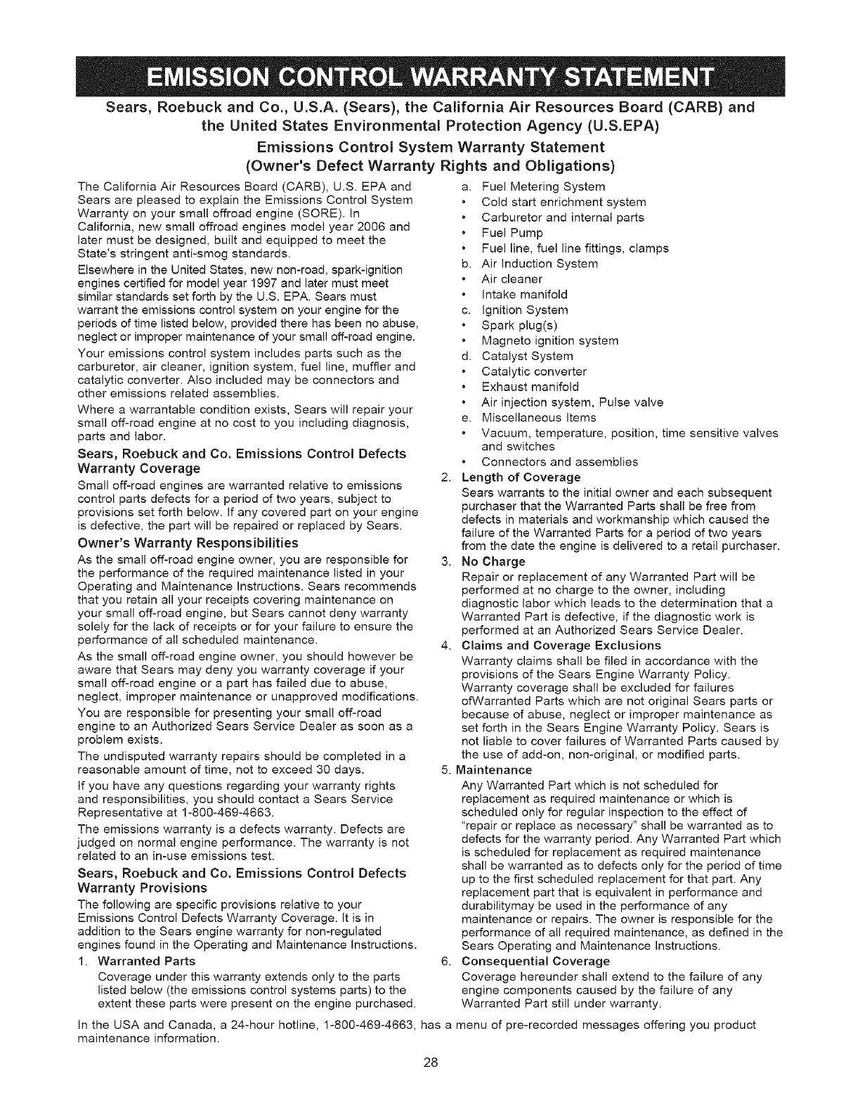 EMISSION CONTROL WARRANTY .............. 28-29