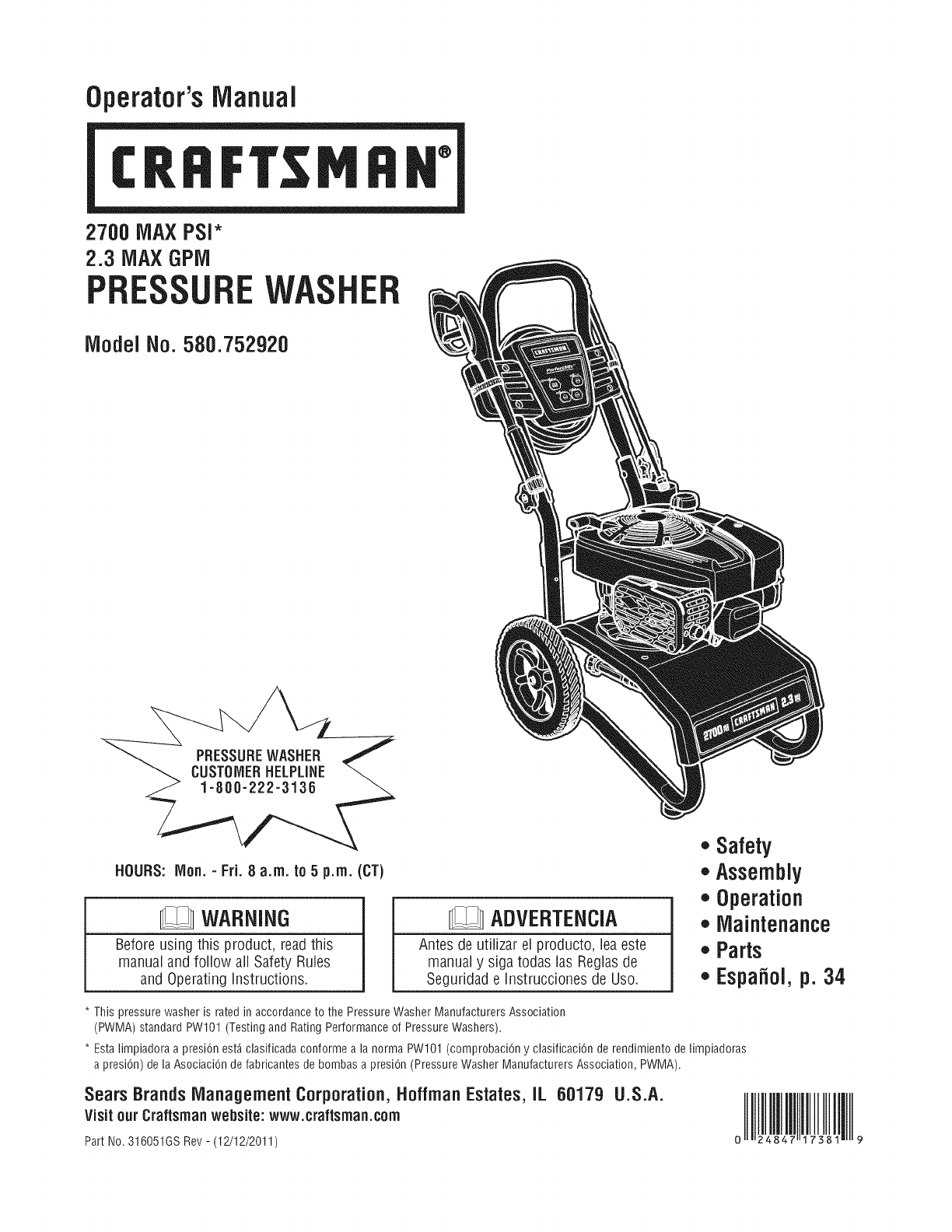 User Manual: Craftsman 580752920 580752920 CRAFTSMAN PRESSURE WASHER - Manuals and Guides View the owners manual for your CRAFTSMAN PRESSURE WASHER #580752920. Home:Lawn & Garden Parts:Craftsman Parts:Craftsman PRESSURE WASHER Manual