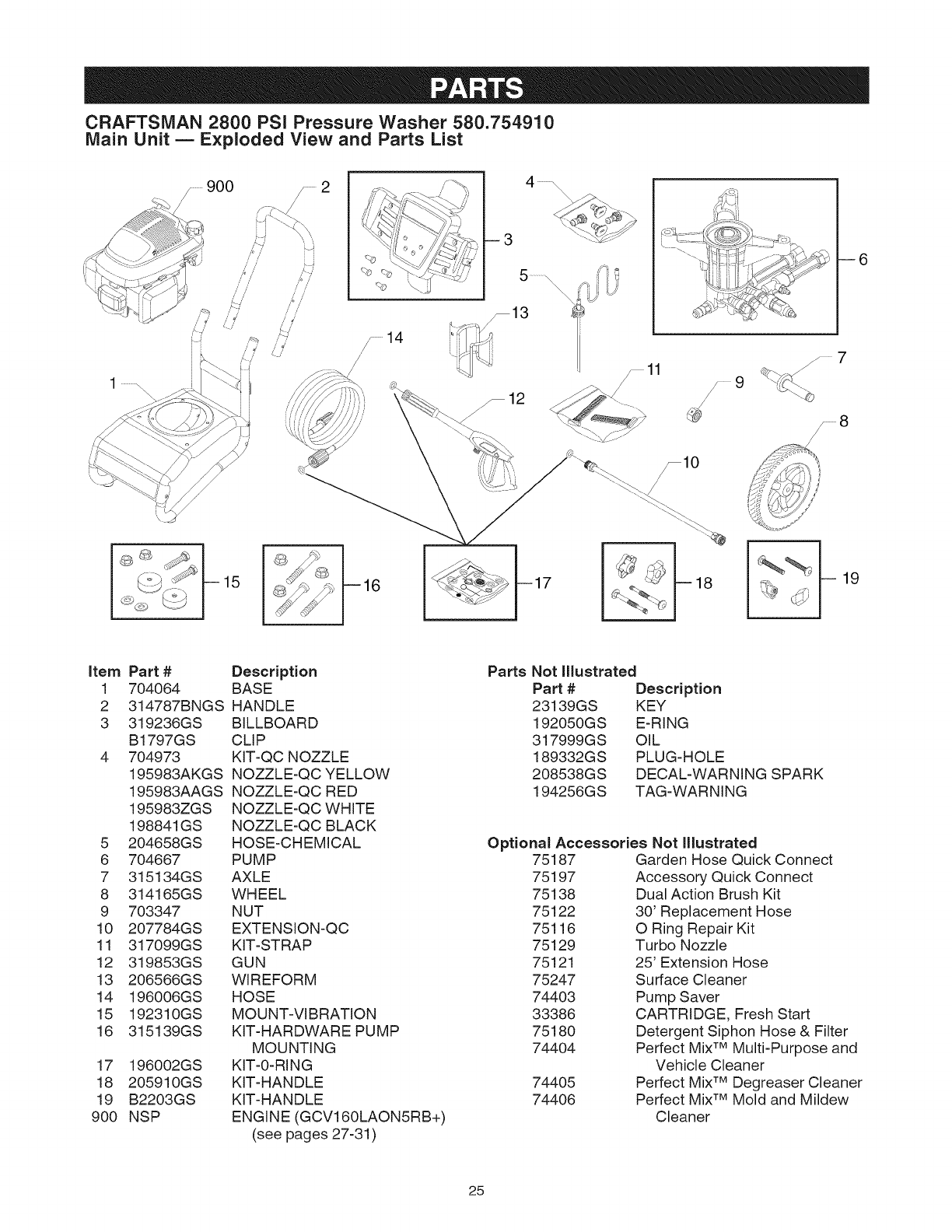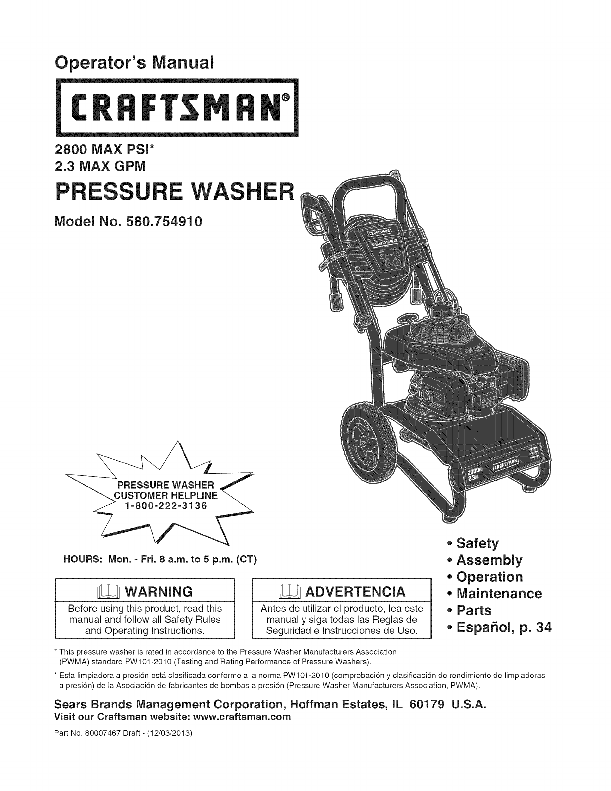 User Manual: Craftsman 580754910 580754910 CRAFTSMAN GAS POWER WASHER - Manuals and Guides View the owners manual for your CRAFTSMAN GAS POWER WASHER #580754910. Home:Lawn & Garden Parts:Craftsman Parts:Craftsman GAS POWER WASHER Manual