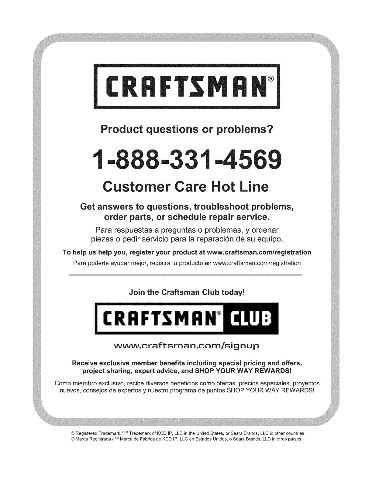 Para poderte ayudar mejor, registra tu producto en www.craftsman.com/registration