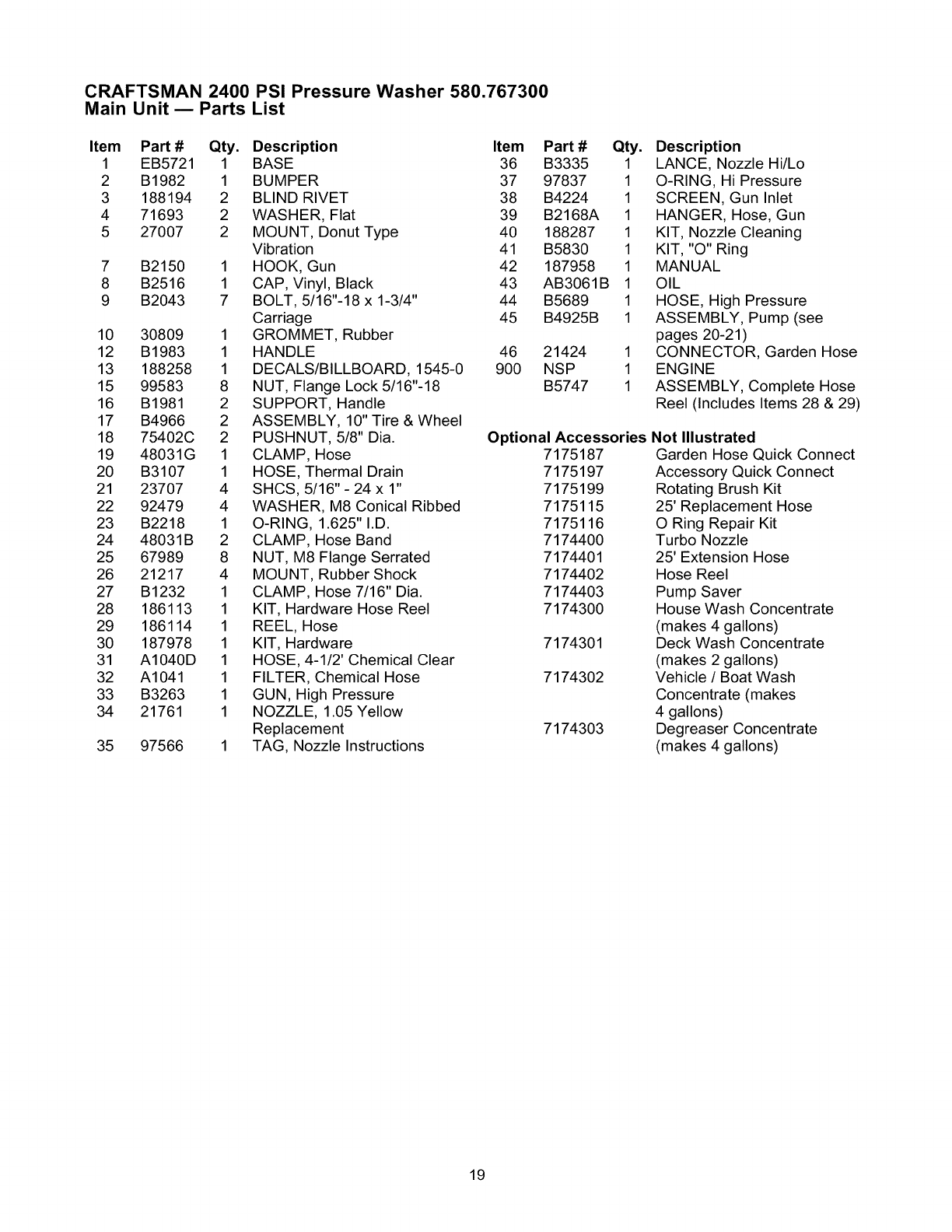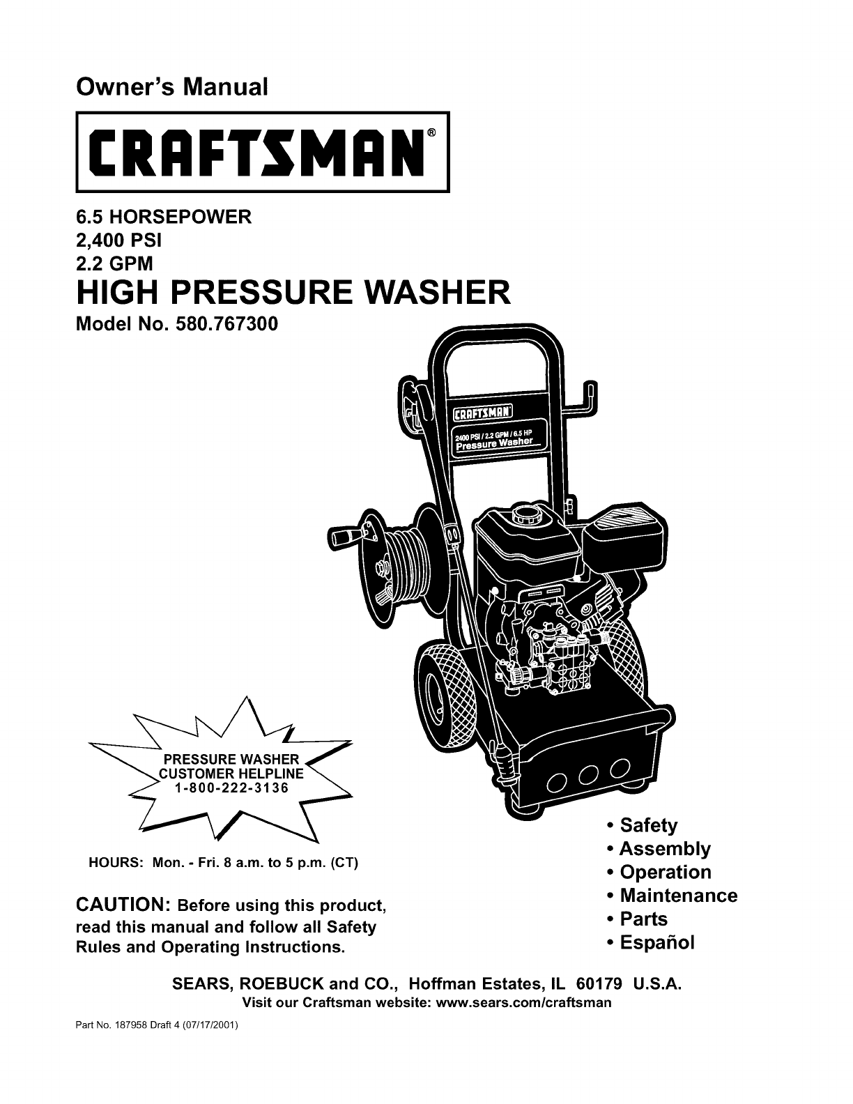 User Manual: Craftsman 580767300 580767300 CRAFTSMAN PRESSURE WASHER - Manuals and Guides View the owners manual for your CRAFTSMAN PRESSURE WASHER #580767300. Home:Lawn & Garden Parts:Craftsman Parts:Craftsman PRESSURE WASHER Manual