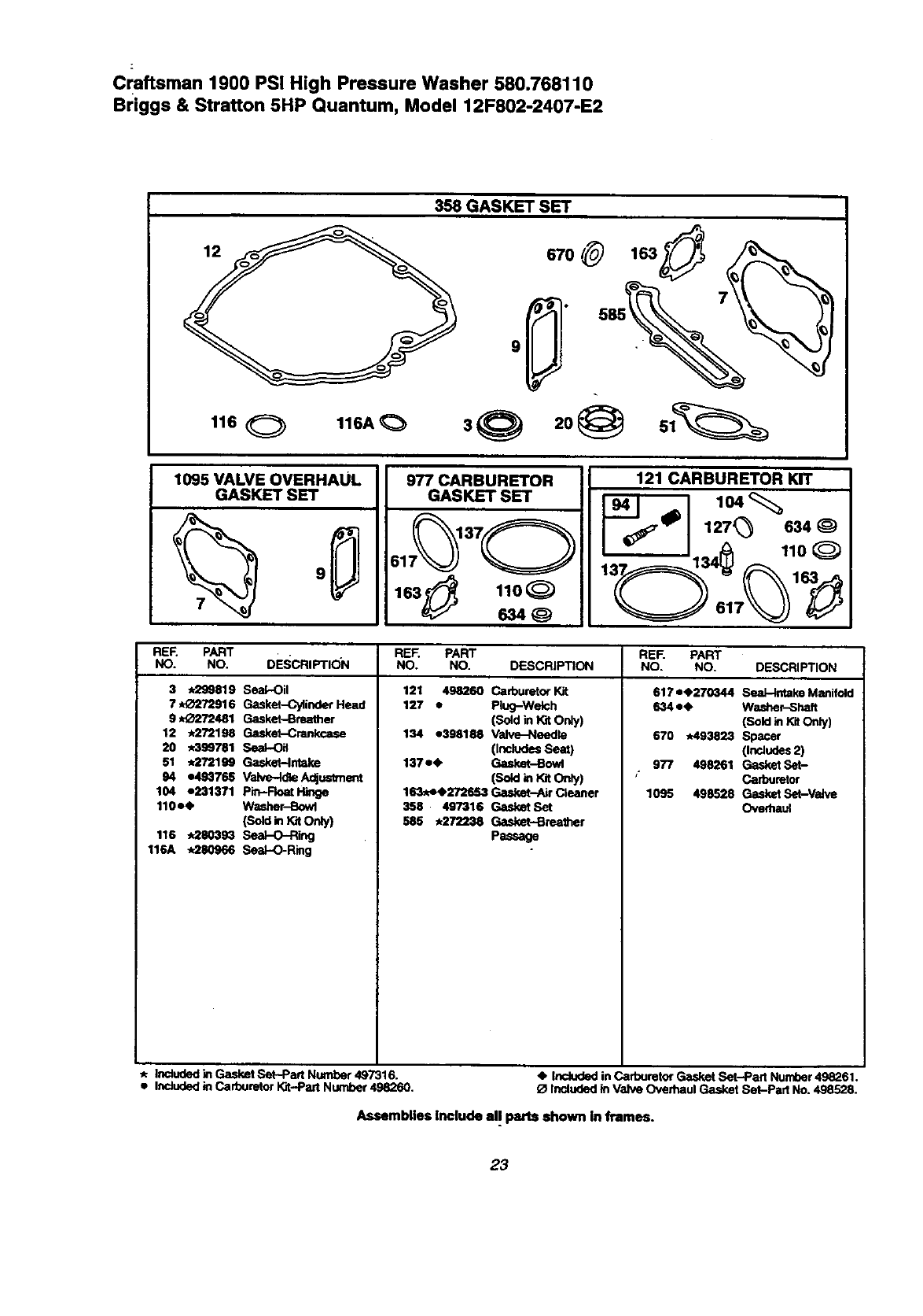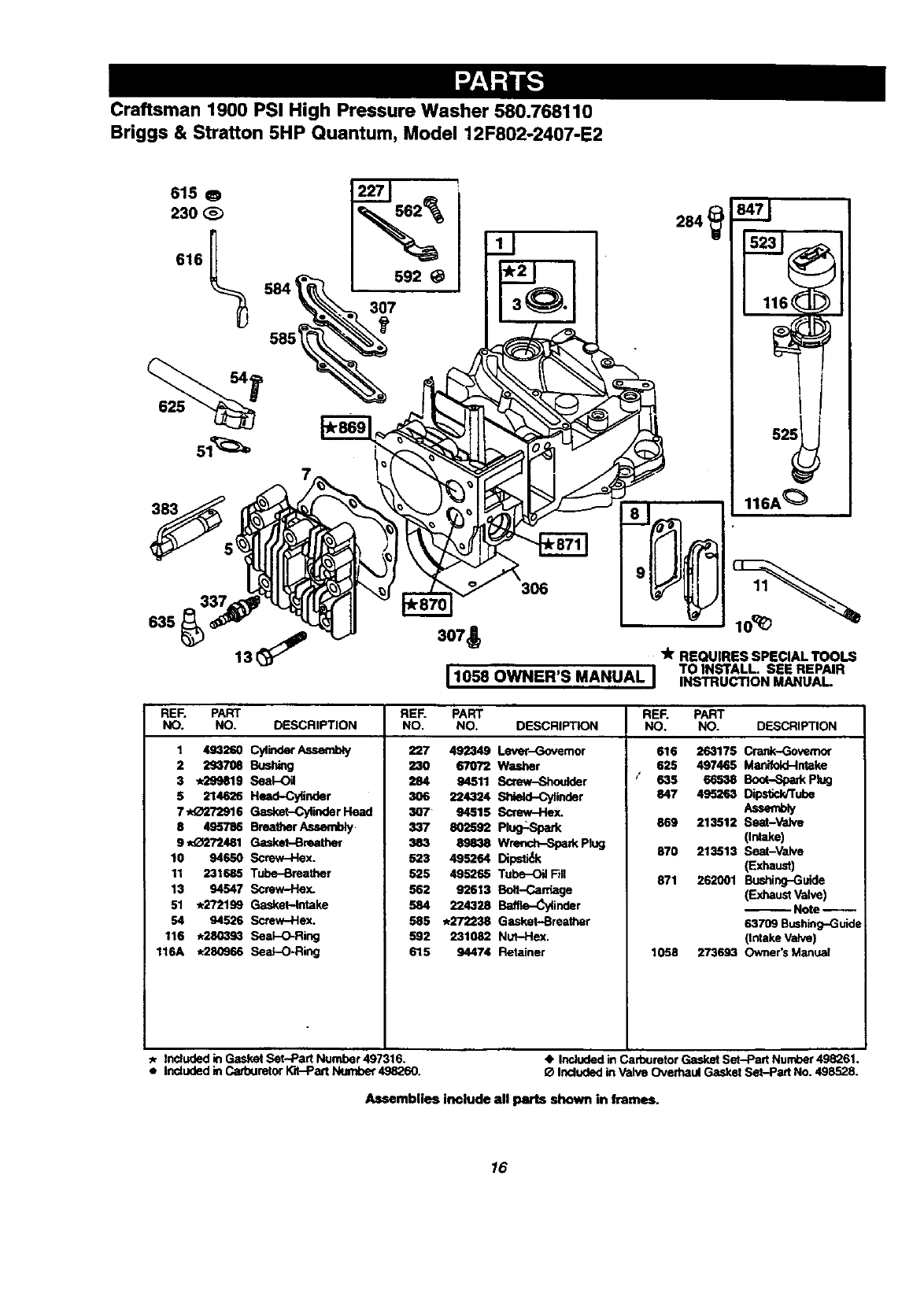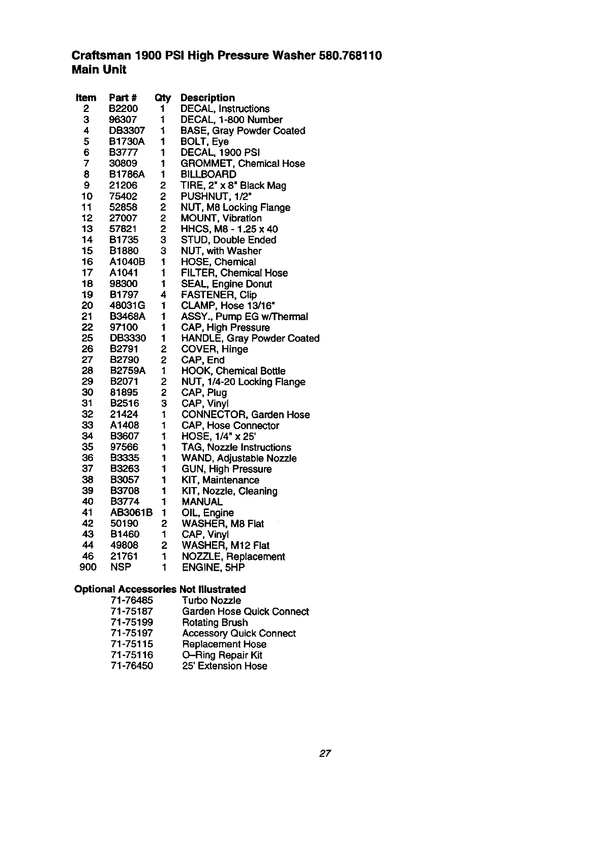 User Manual: Craftsman 580768110 580768110 CRAFTSMAN HIGH PRESSURE WASHER - Manuals and Guides View the owners manual for your CRAFTSMAN HIGH PRESSURE WASHER #580768110. Home:Lawn & Garden Parts:Craftsman Parts:Craftsman HIGH PRESSURE WASHER Manual