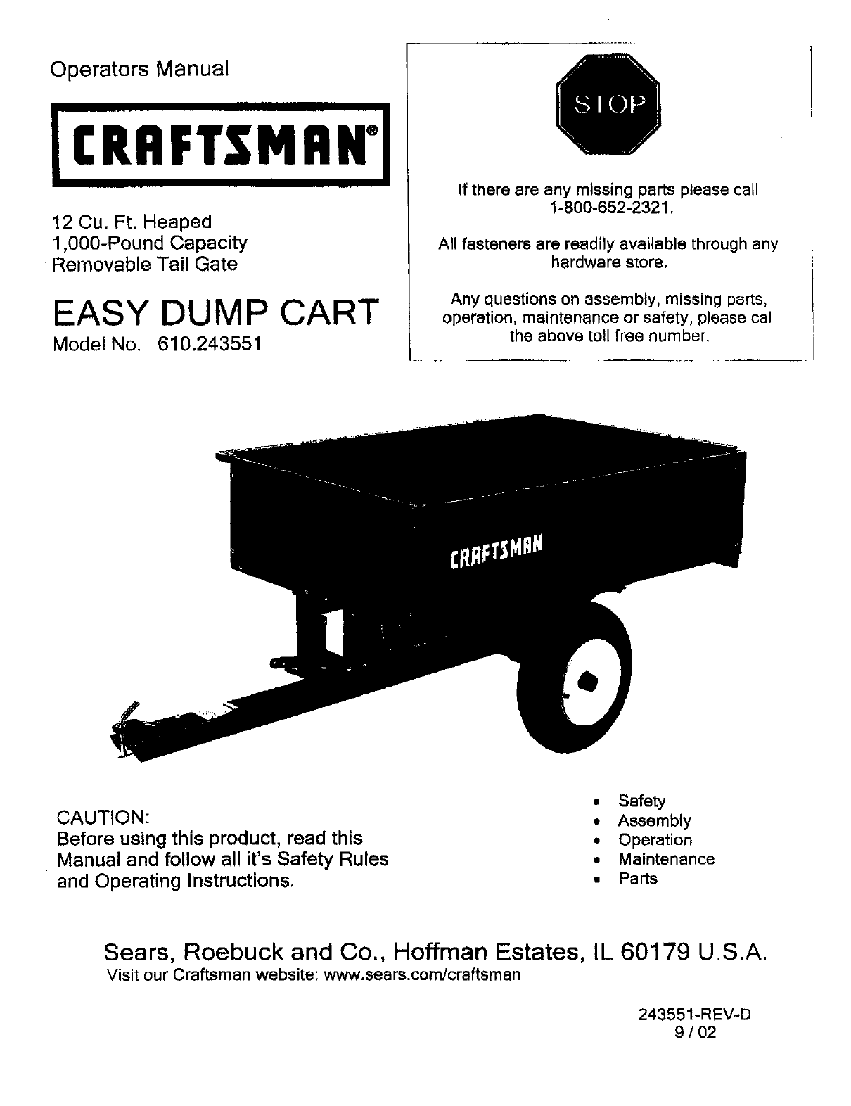 User Manual: Craftsman 610243551 610243551 CRAFTSMAN DUMP CART - Manuals and Guides View the owners manual for your CRAFTSMAN DUMP CART #610243551. Home:Lawn & Garden Parts:Craftsman Parts:Craftsman DUMP CART Manual