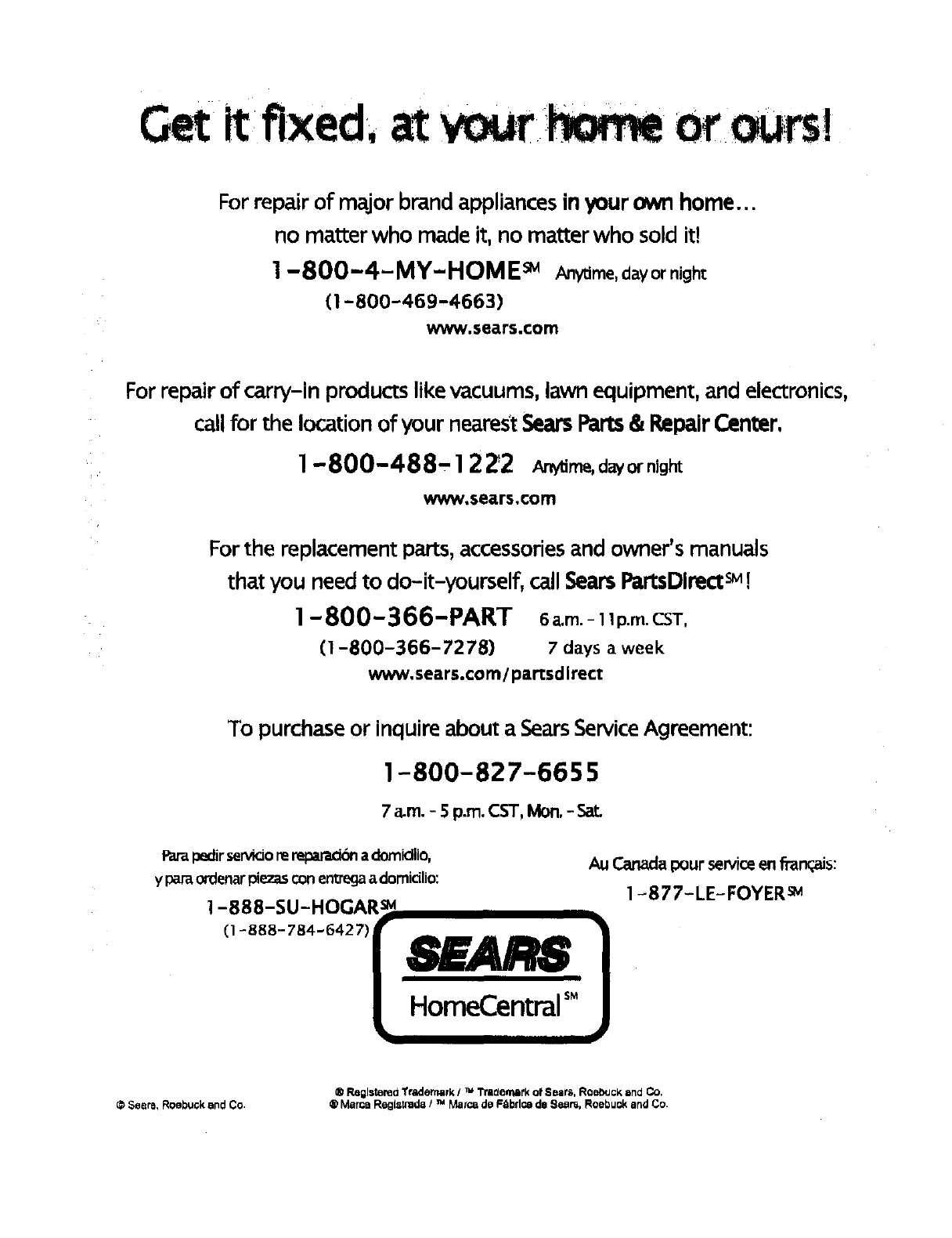 call for the location of your nearest Sears Parts &Repair Center,