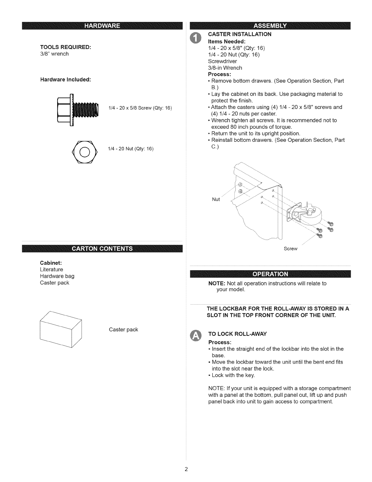 •Attach the casters using (4) 1/4 - 20 x 5/8" screws and