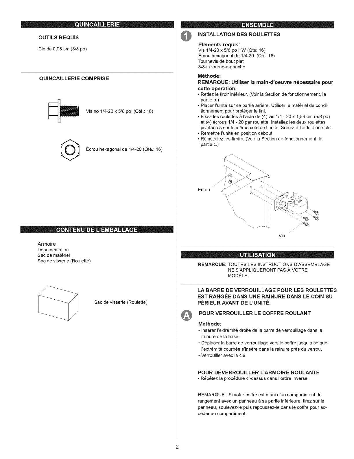 et (4) ecrous 1/4 - 20 par roulette. Installez les deux roulettes
