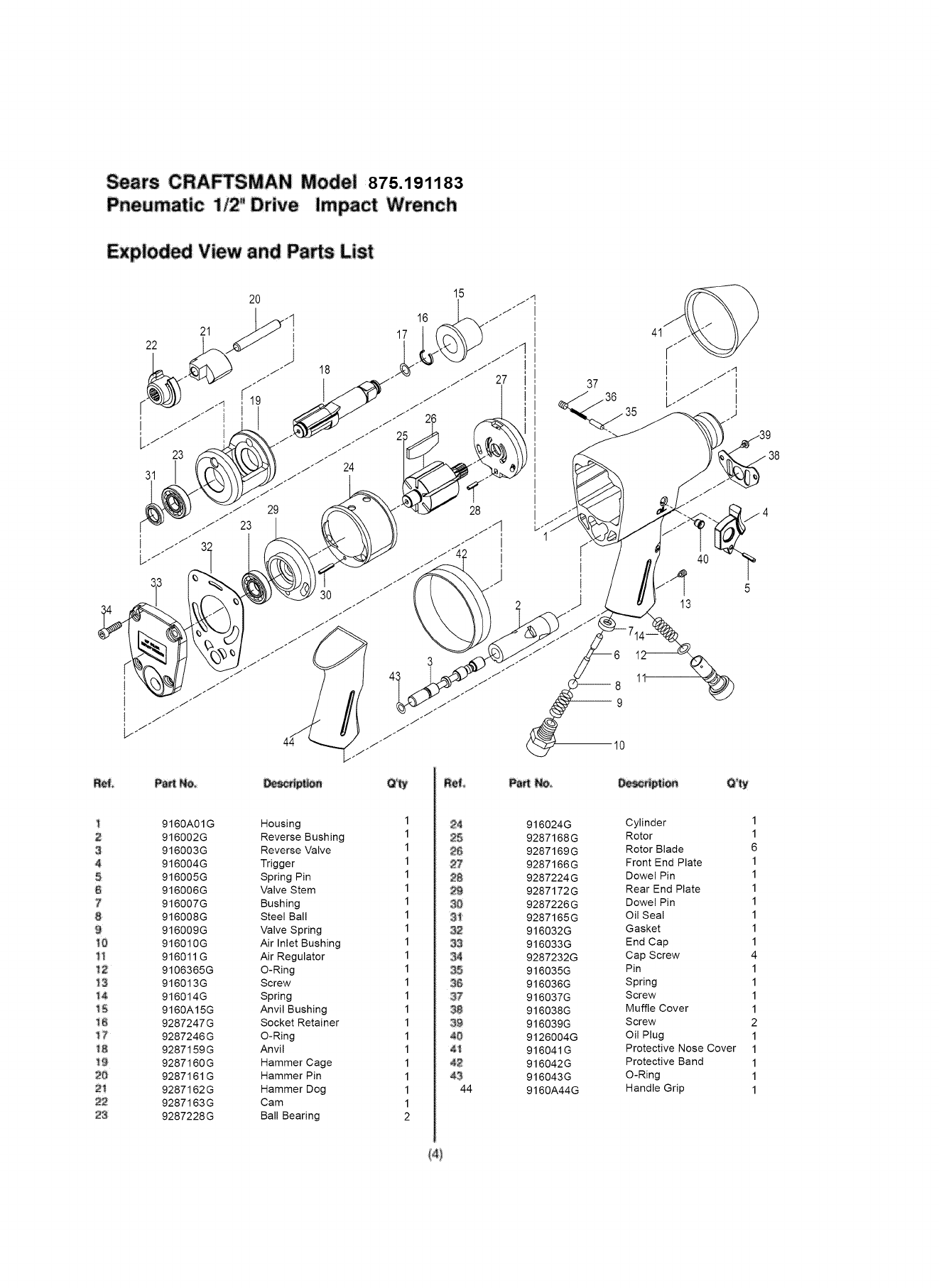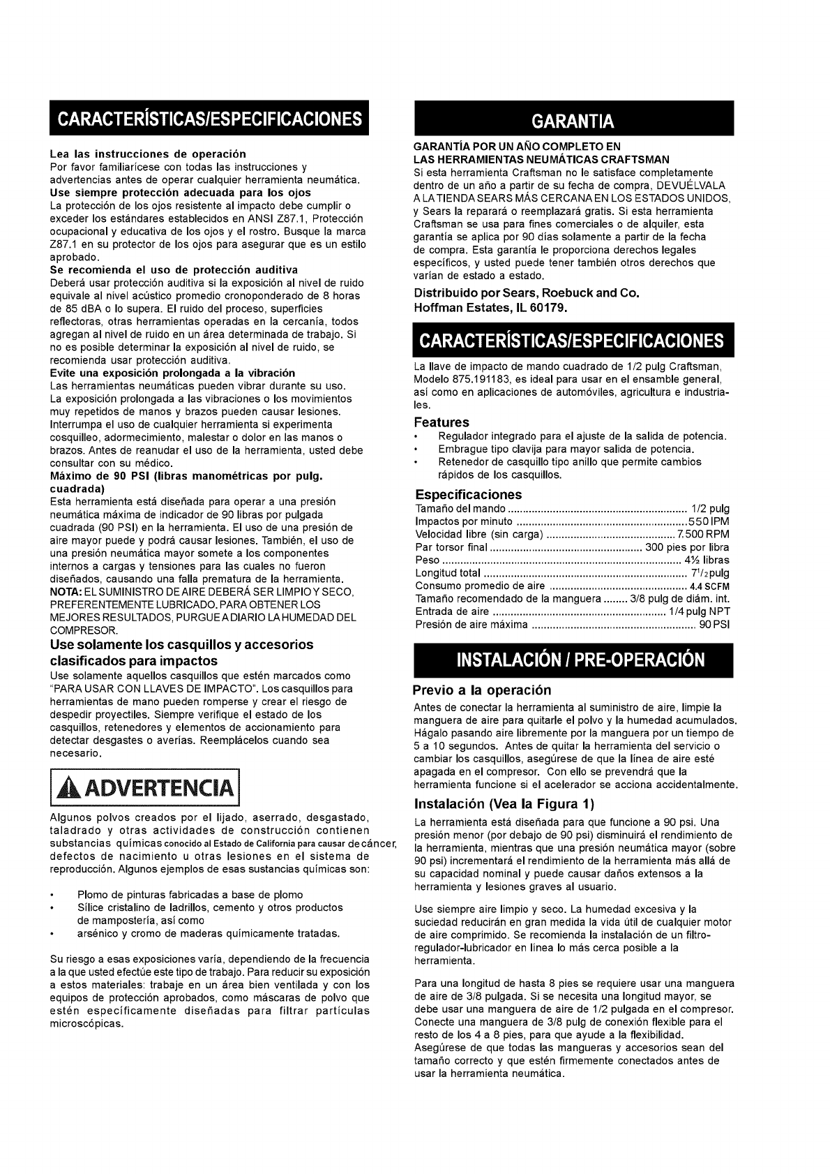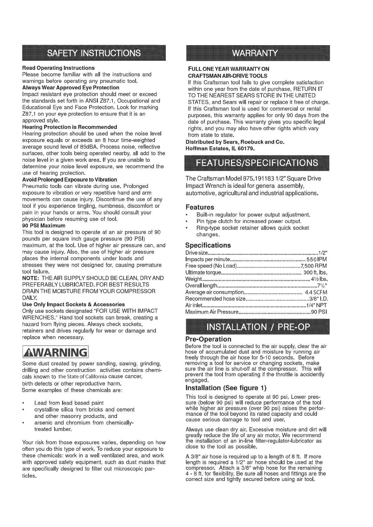 User Manual: Craftsman 875191183 875191183 CRAFTSMAN IMPACT WRENCH - Manuals and Guides View the owners manual for your CRAFTSMAN IMPACT WRENCH #875191183. Home:Tool Parts:Craftsman Parts:Craftsman IMPACT WRENCH Manual
