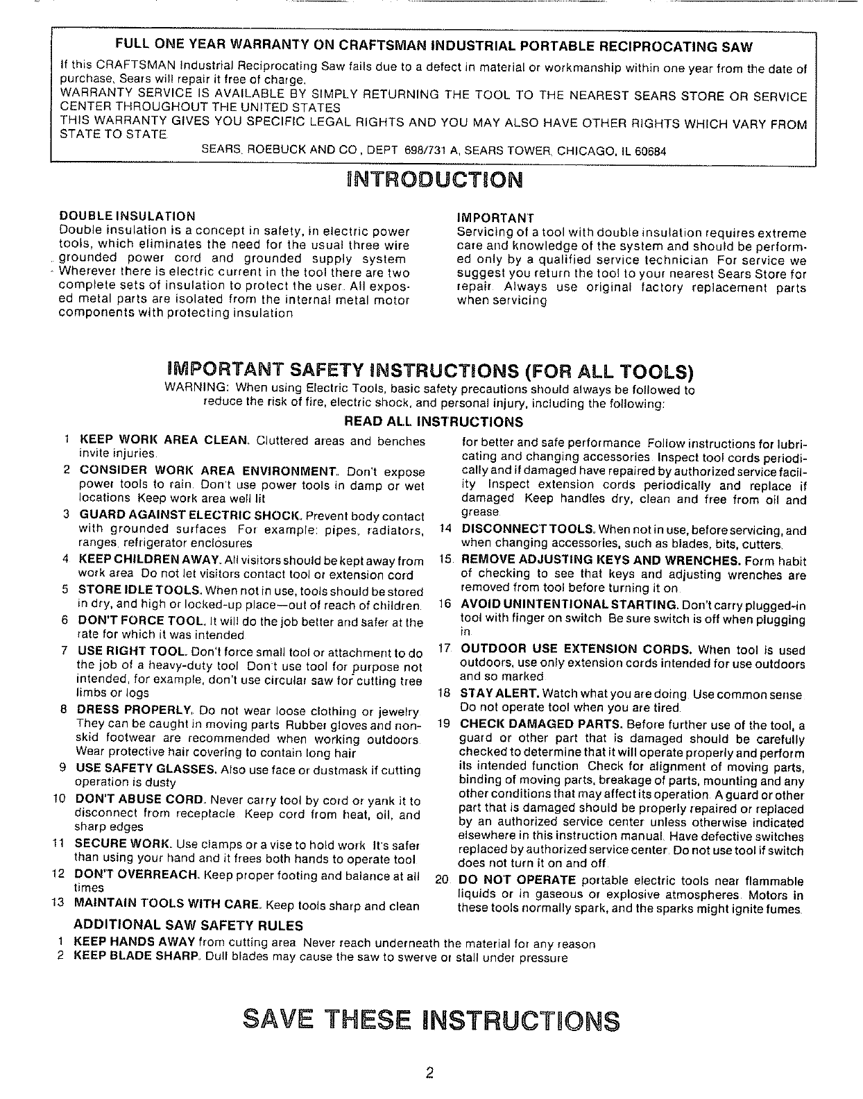 FULL ONE YEAR WARRANTY ON CRAFTSMAN INDUSTRIAL PORTABLE RECIPROCATING SAW