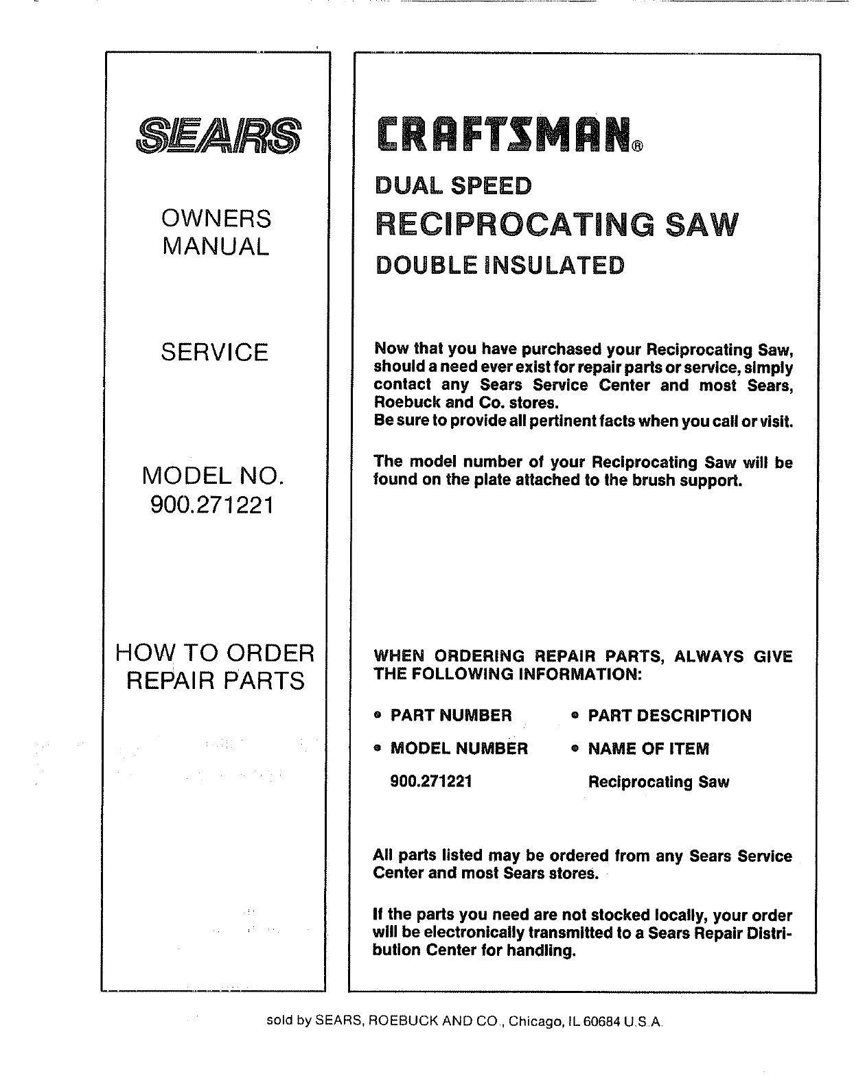 User Manual: Craftsman 900271221 900271221 CRAFTSMAN DUAL SPEED RECIPROCATING SAW - Manuals and Guides View the owners manual for your CRAFTSMAN DUAL SPEED RECIPROCATING SAW #900271221. Home:Tool Parts:Craftsman Parts:Craftsman DUAL SPEED RECIPROCATING SAW Manual
