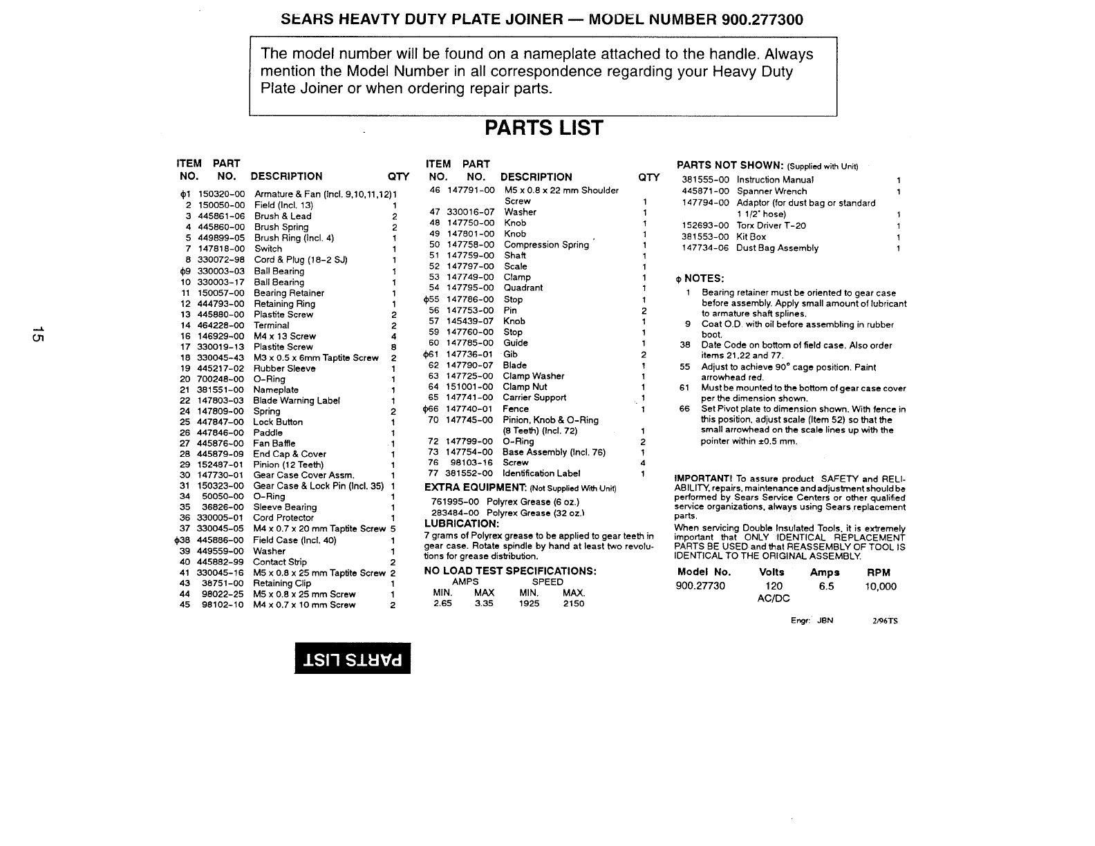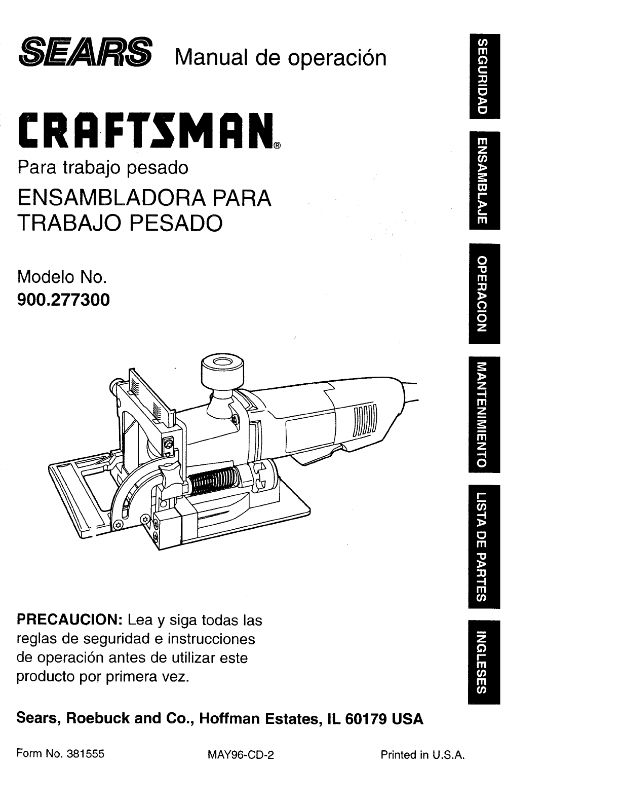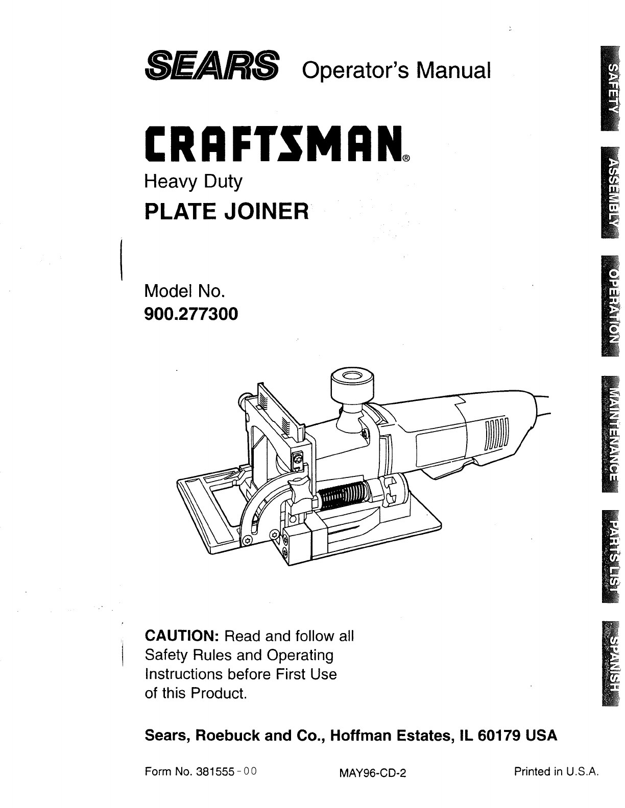 User Manual: Craftsman 900277300 900277300 CRAFTSMAN PLATE JOINER - Manuals and Guides View the owners manual for your CRAFTSMAN PLATE JOINER #900277300. Home:Tool Parts:Craftsman Parts:Craftsman PLATE JOINER Manual
