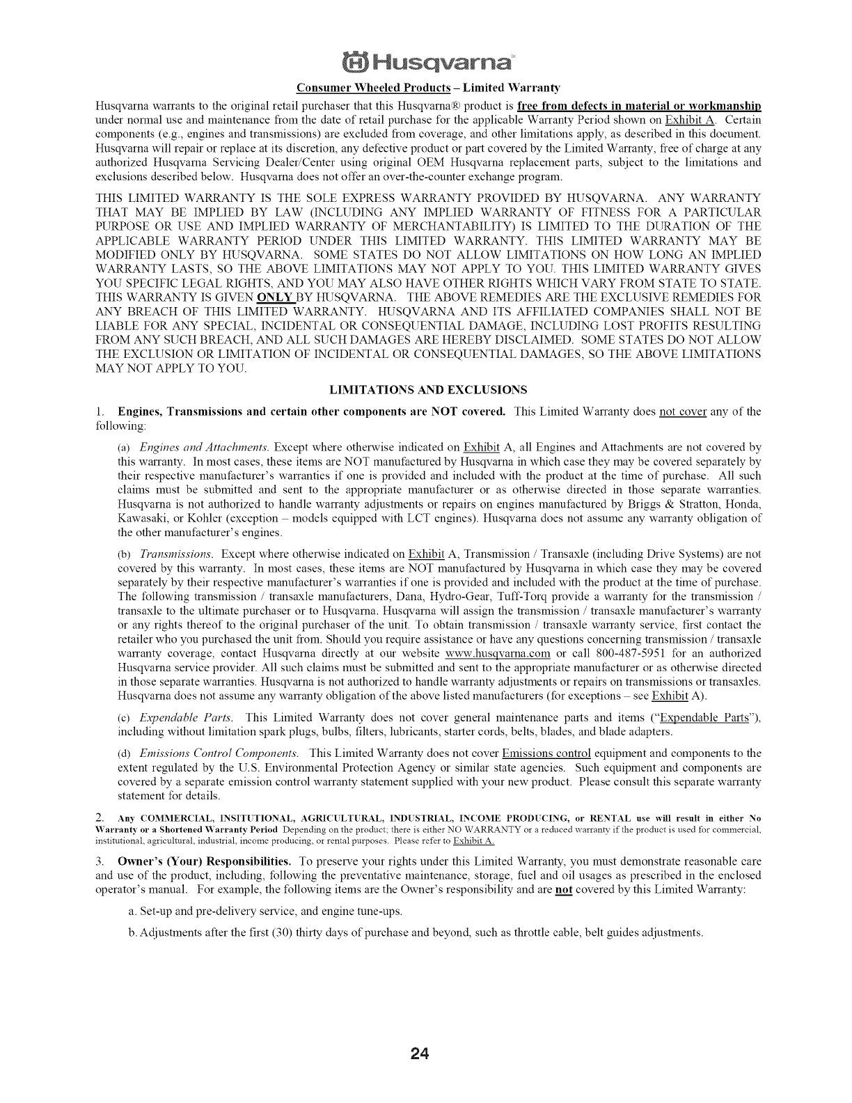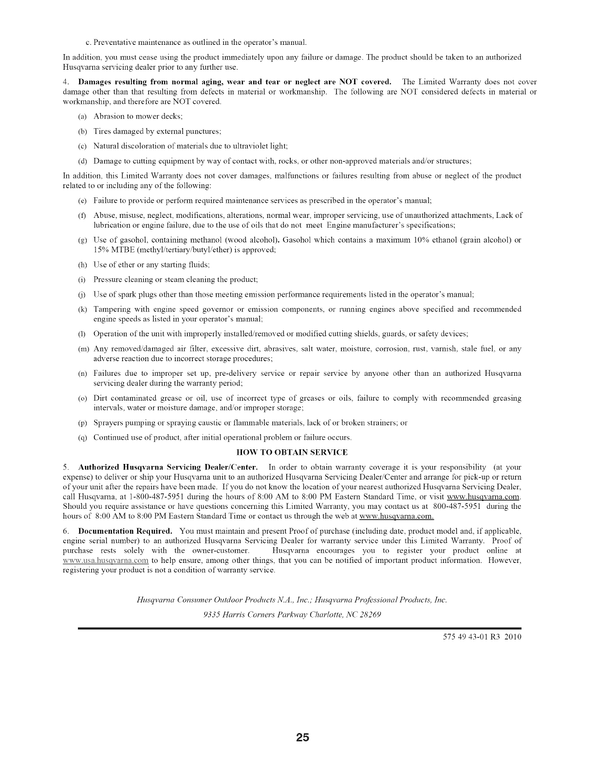 engine serial number) to an authorized Husqvarna Servicing Dealer for warranty service under this Limited Warranty. Proof of