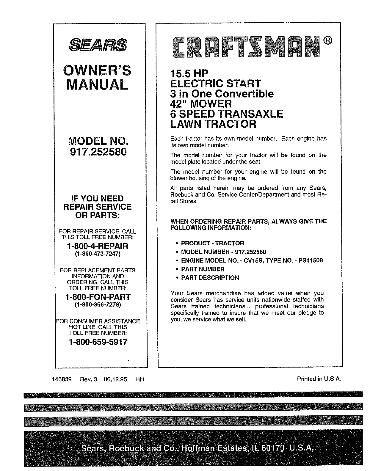146839 Rev. 3 06.12,95 RH Printed in U.SA.