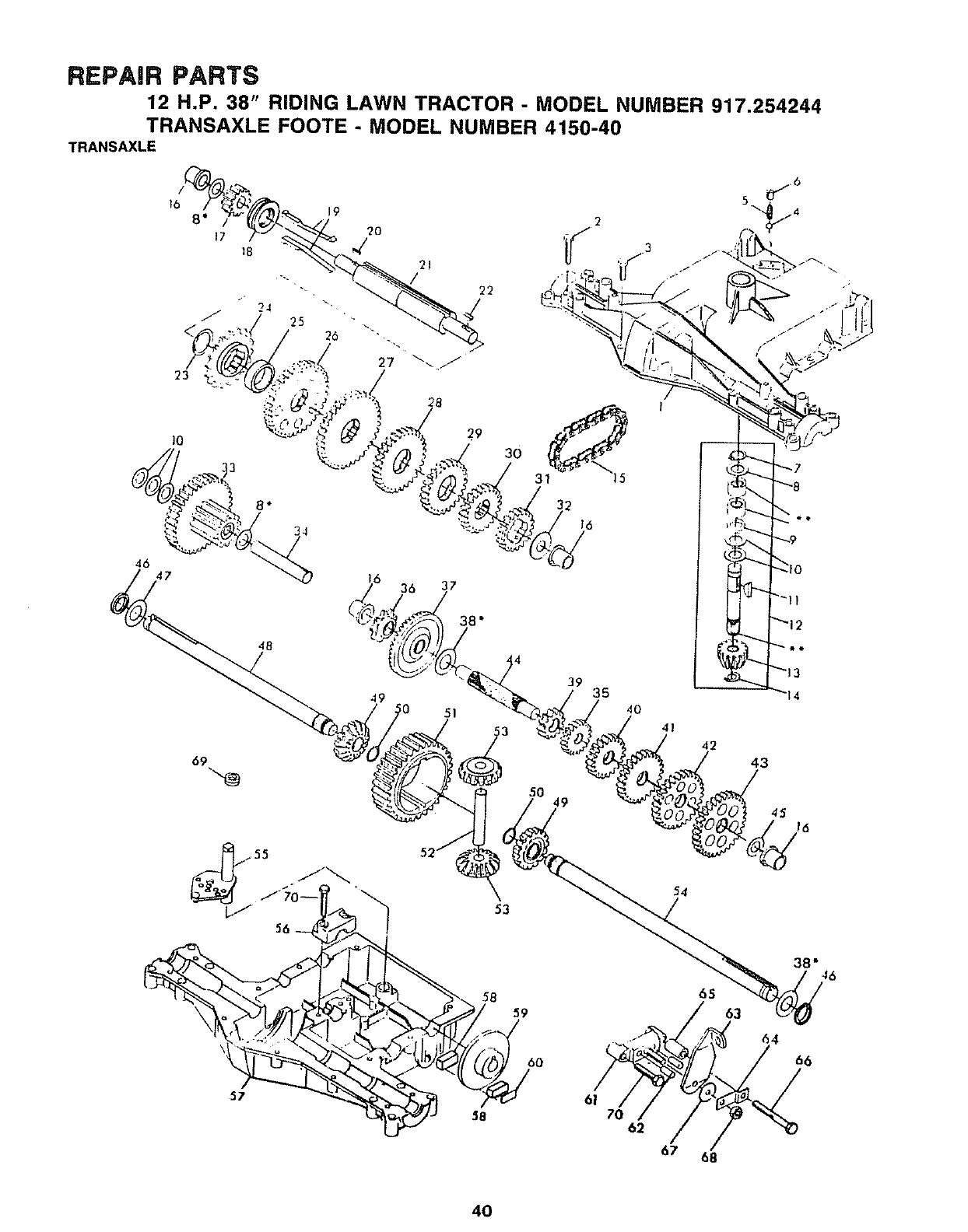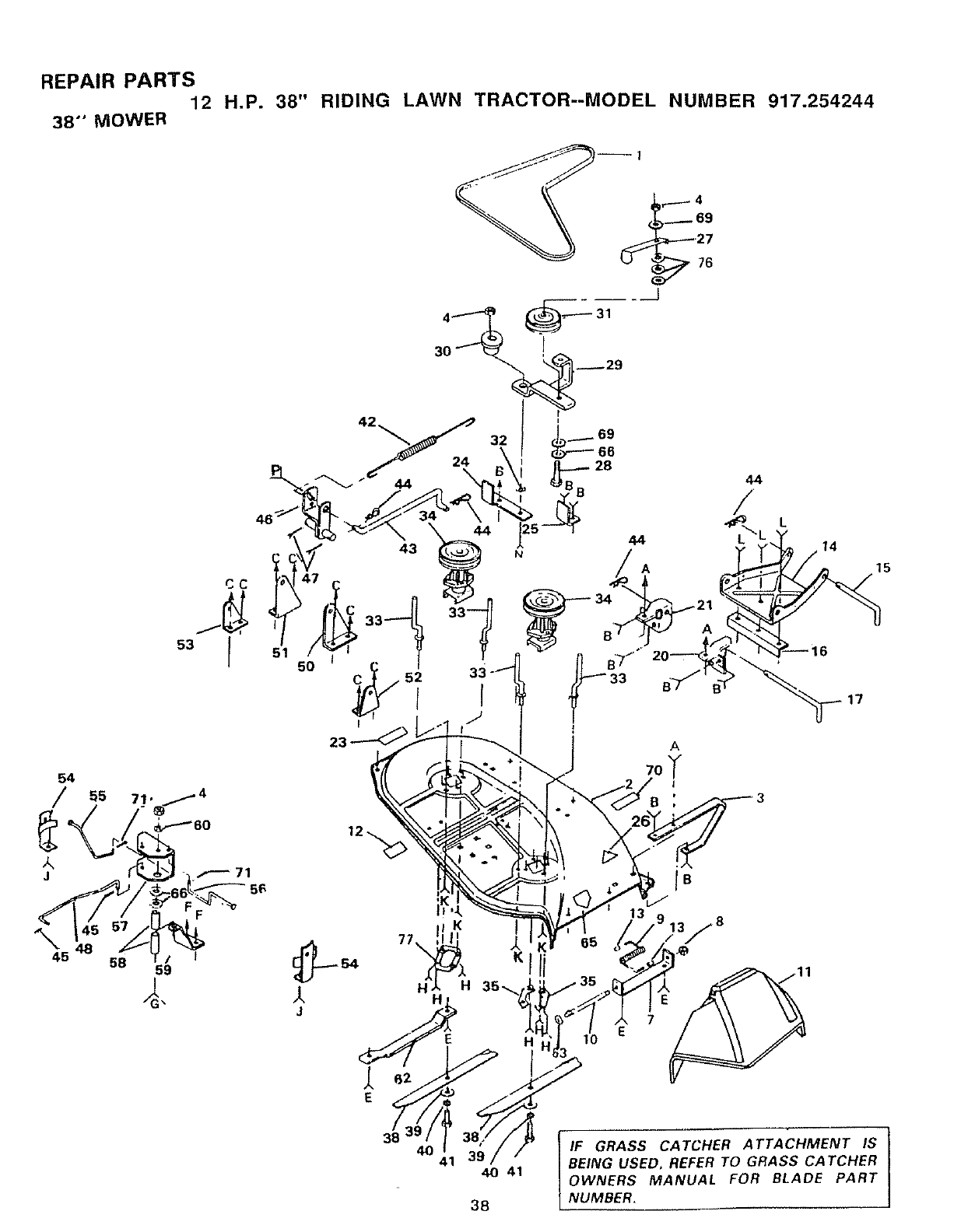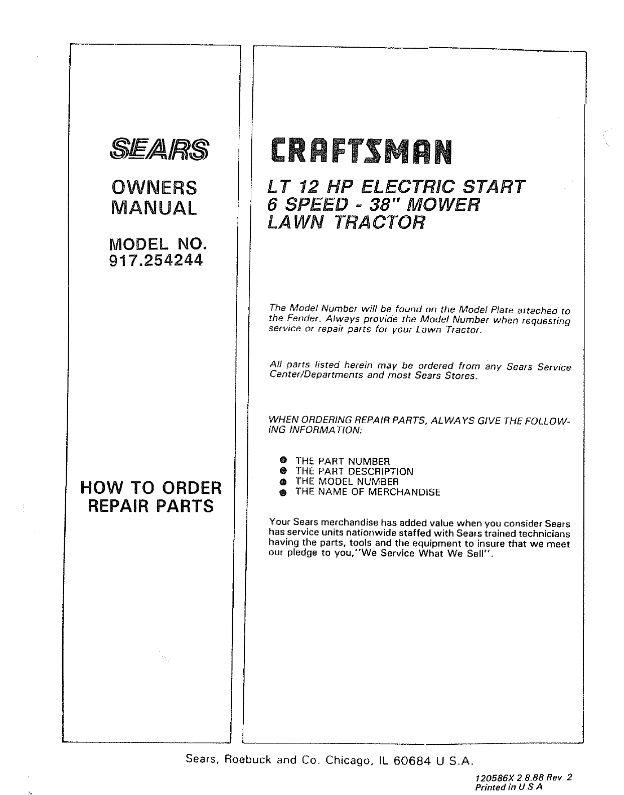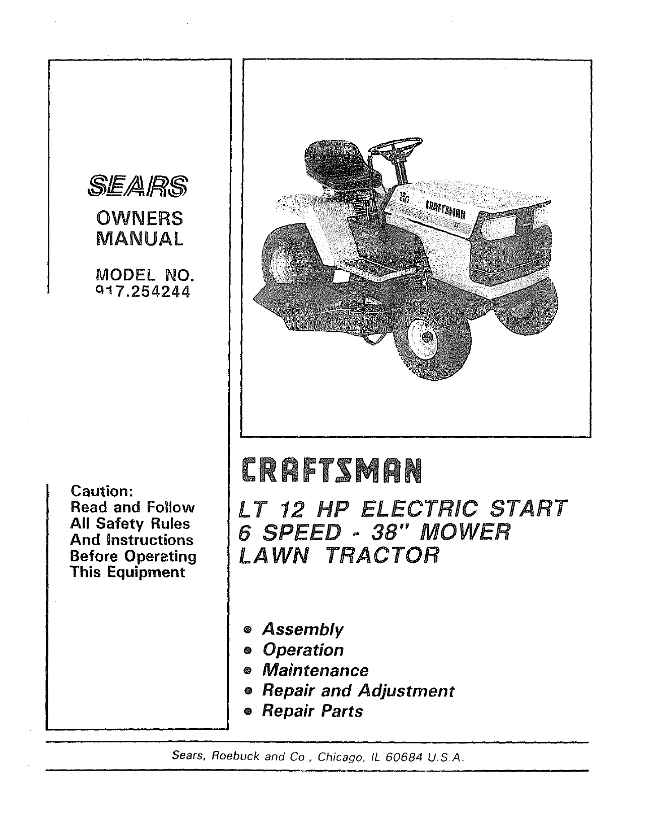 User Manual: Craftsman 917254244 917254244 CRAFTSMAN 38 MOWER LAWN TRACTOR - Manuals and Guides View the owners manual for your CRAFTSMAN 38 MOWER LAWN TRACTOR #917254244. Home:Lawn & Garden Parts:Craftsman Parts:Craftsman 38 MOWER LAWN TRACTOR Manual